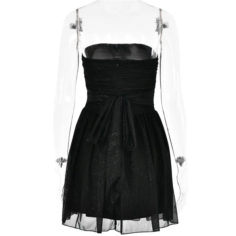 Elegant Strapless Sexy Mini Dress Women Fashion Black Off-Shoulder Backless Pleated Sequins Sparkle Club Party Dress