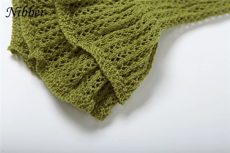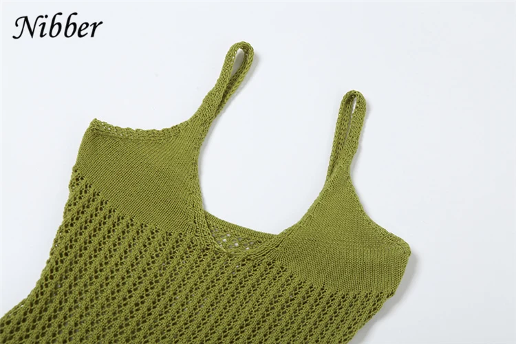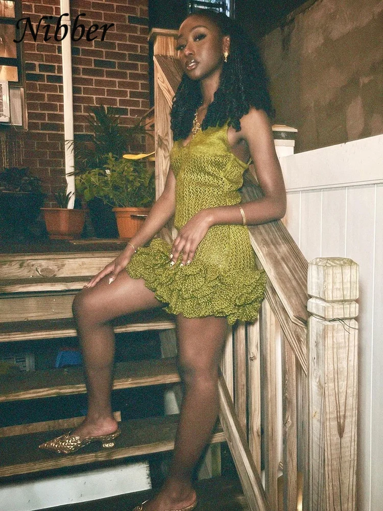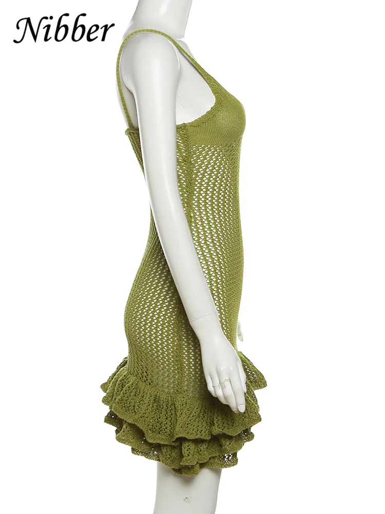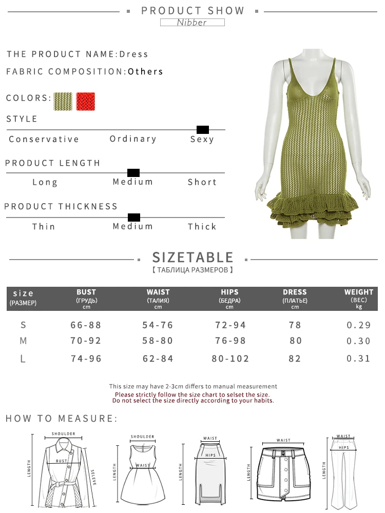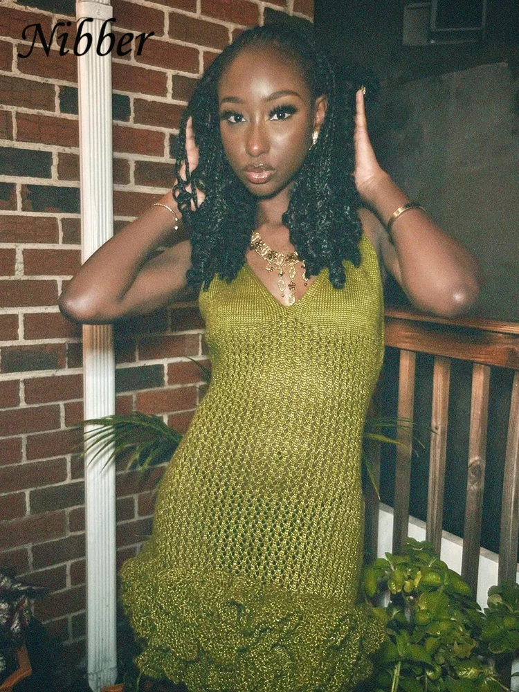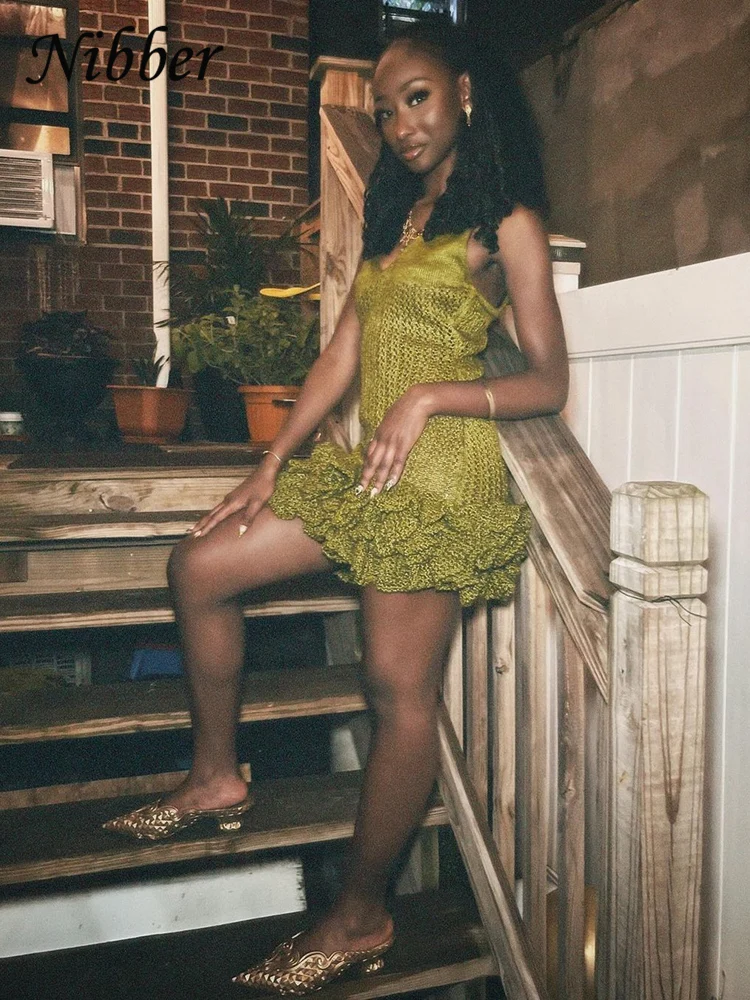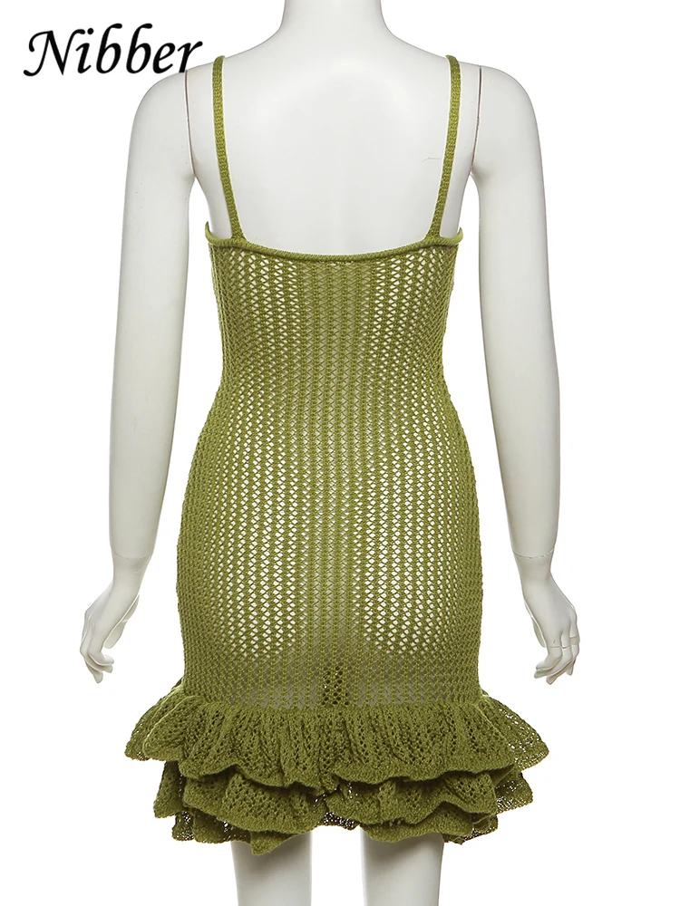 • Knitted Tierred Mini Dress Women Solid See through Strap Deep V-Neck Bodycon Female Midnight Classic Clubwear Clothing
