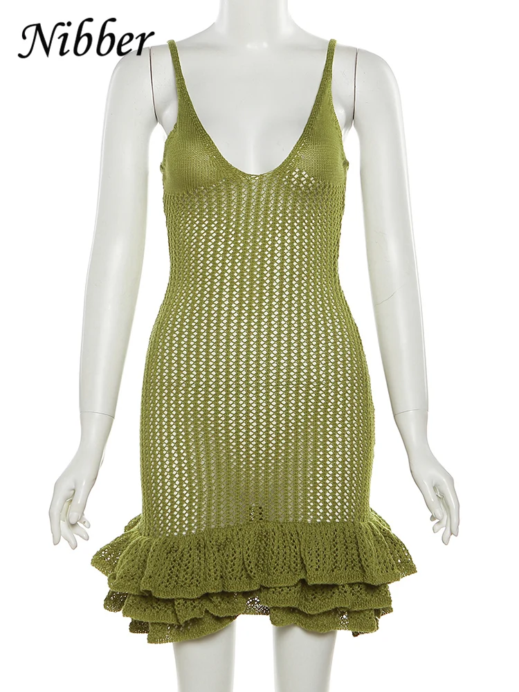 Knitted Tierred Mini Dress Women Solid See through Strap Deep V-Neck Bodycon Female Midnight Classic Clubwear Clothing