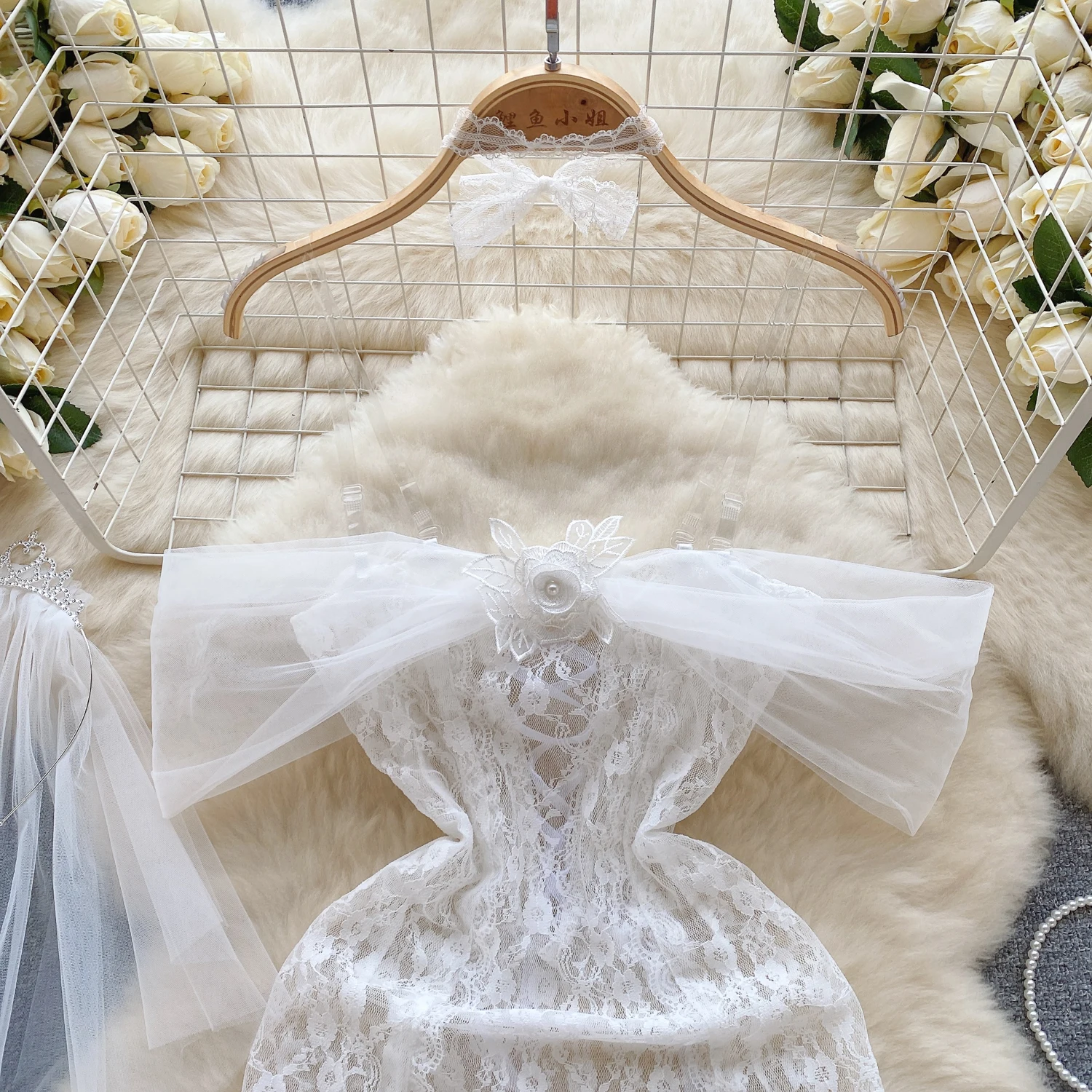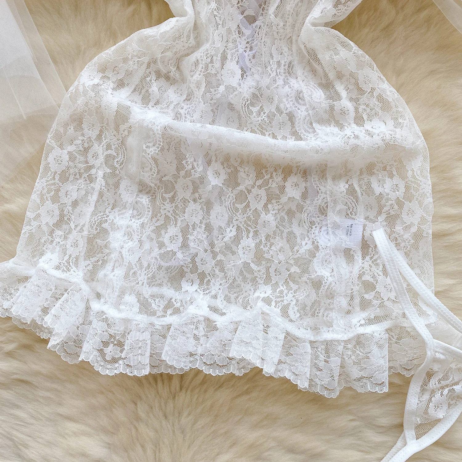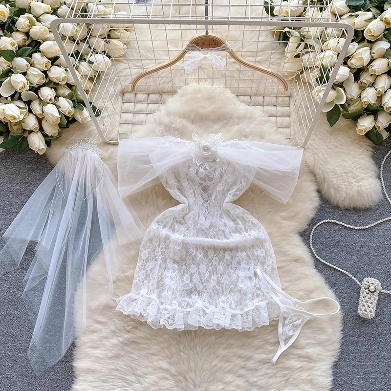 Lady Sexy Butterfly Suits 3-Piece Hotsweet One Shoulder Crown Lace Cosplay Uniform Bridal Dress Fun Underwear See-Through New