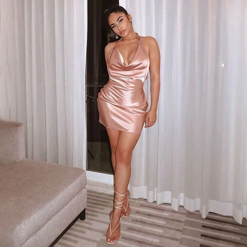 • Sexy Halterneck Swing Collar Women Satin Dresses Sleeveless Summer Backless Fashion Elegant Short Mini Dress Women'S 2024