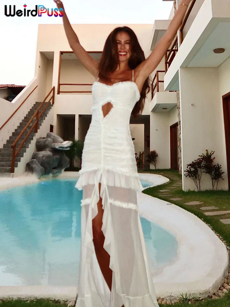 • Sexy Lace Dress Women 2025 Summer Trend Y2K Hollow Sleeveless Ruched Tierred Midnight Party Stretch Club Mini Bodycon