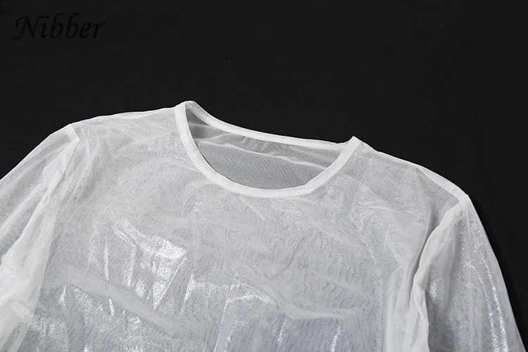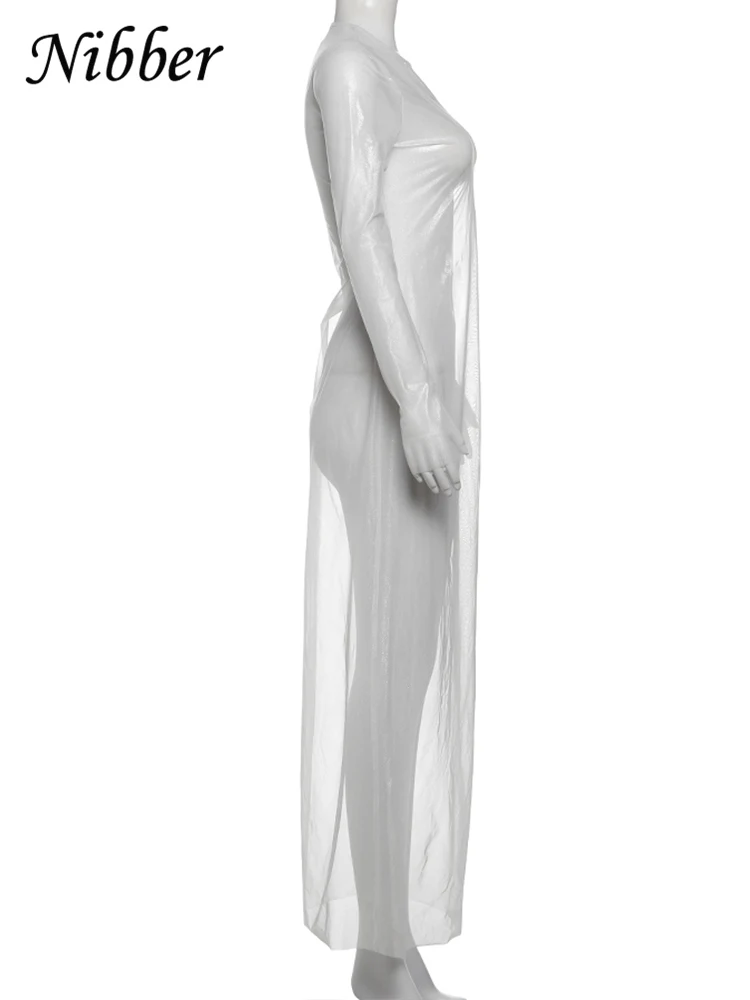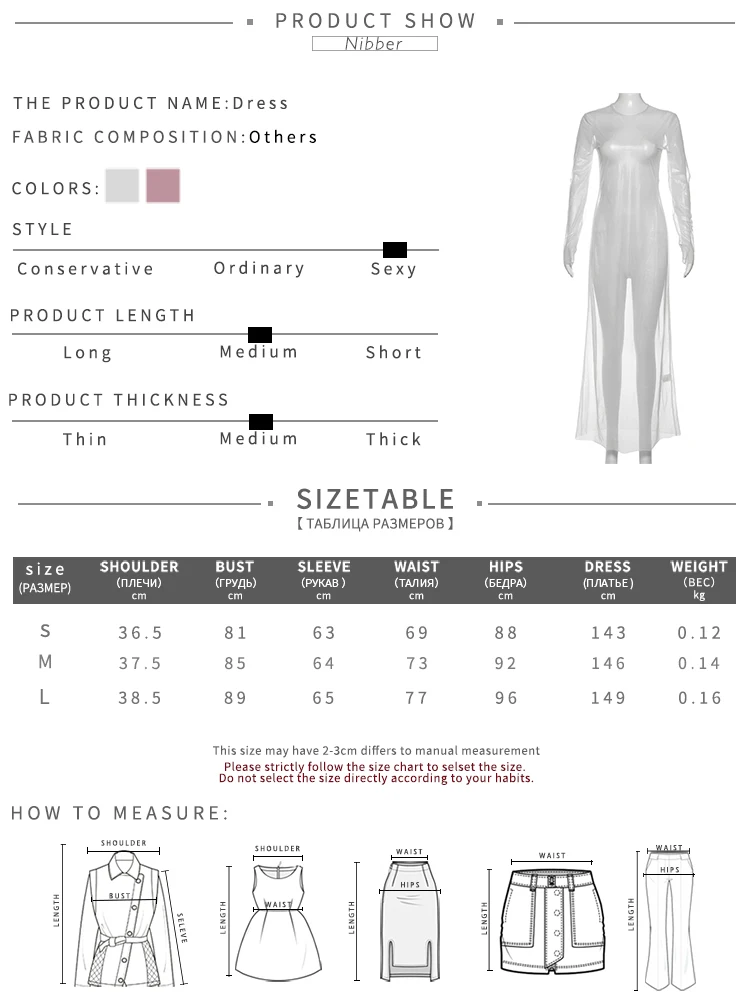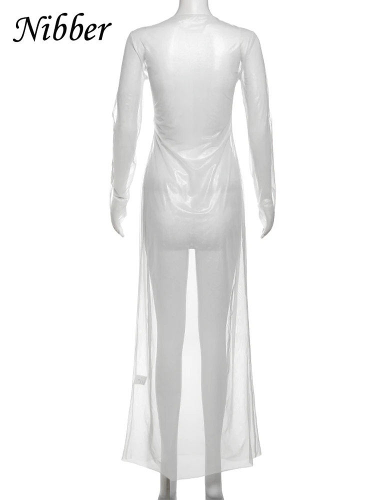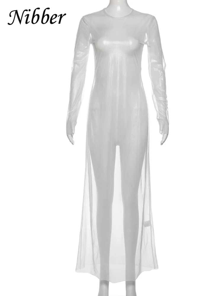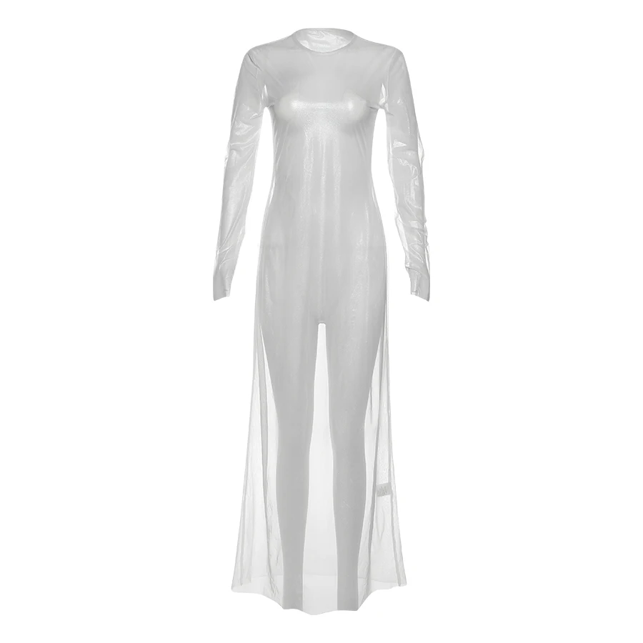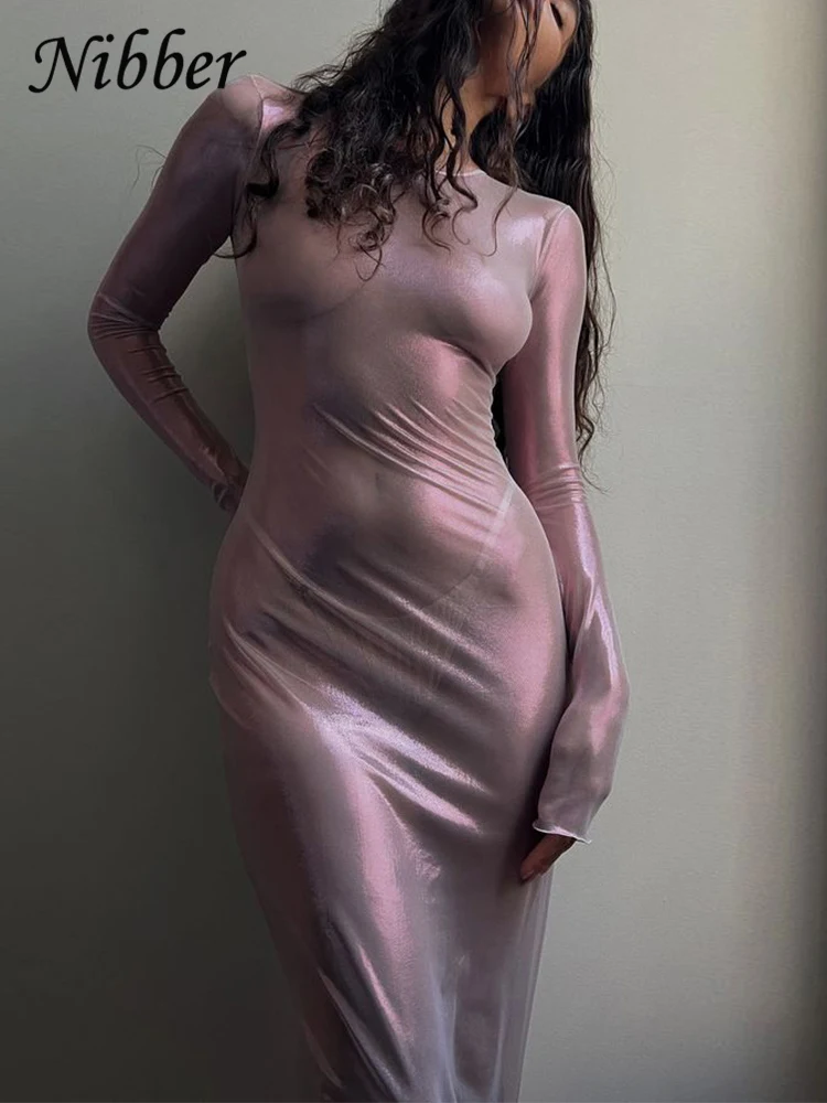 • Sexy See through Dress Women O-Neck Full Sleeve Skinny Reflective Wild Midnight Party Coquettish Stretch Long Bodycon