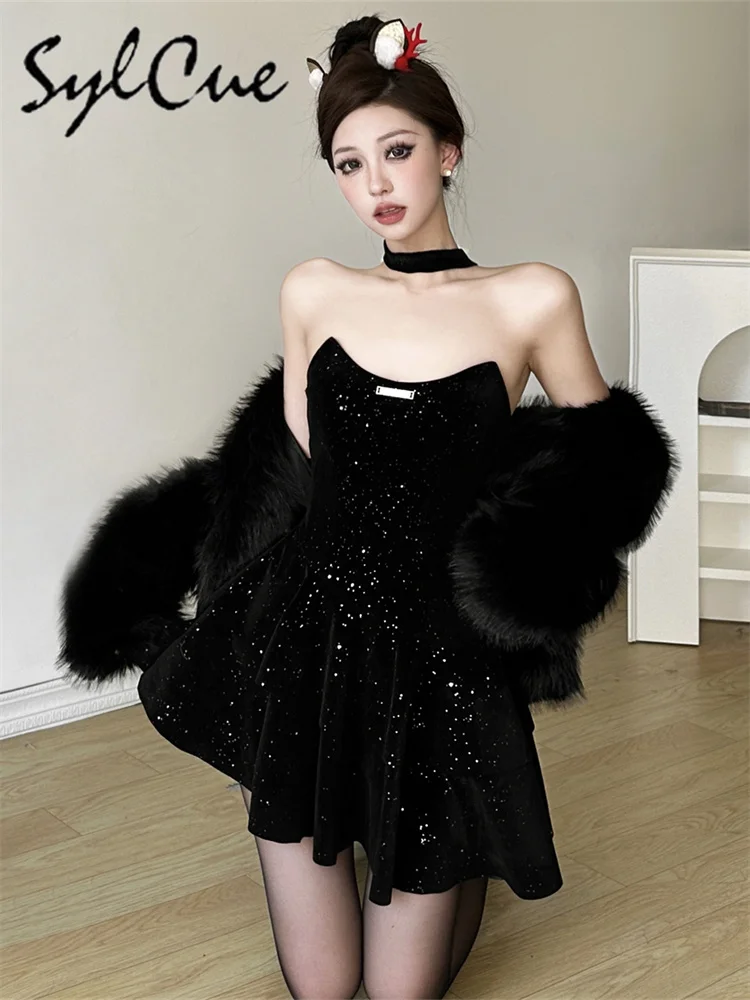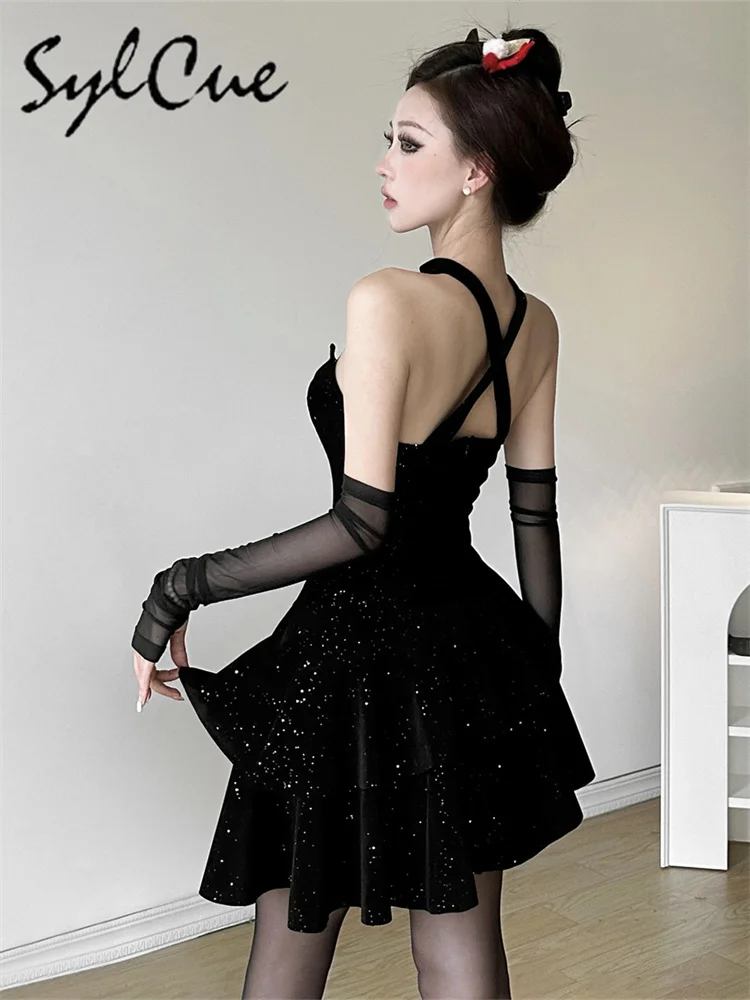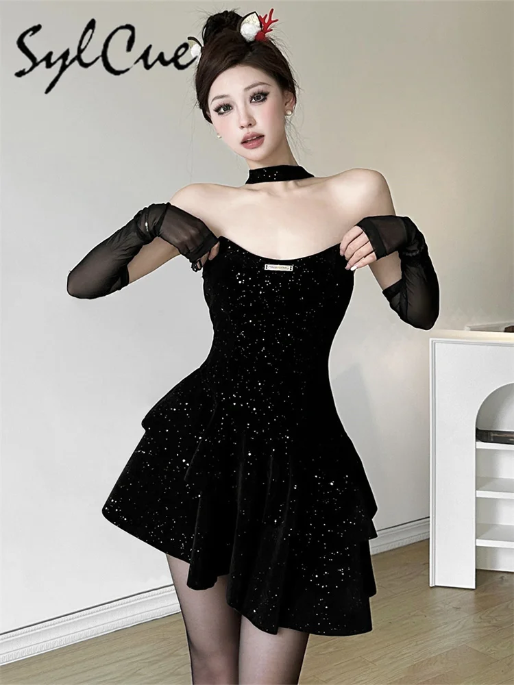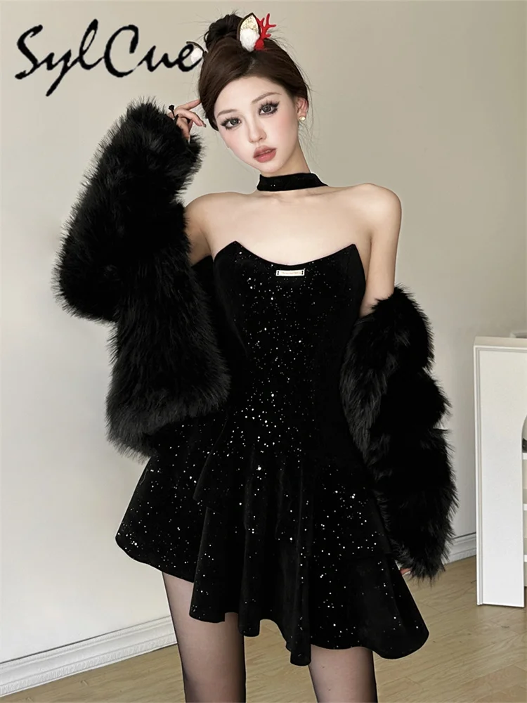 • Winter Sister Party Dignified Intellectual Elegant Mature Beautiful Gentle Sweet Women'S Black Irregular Halter Dress