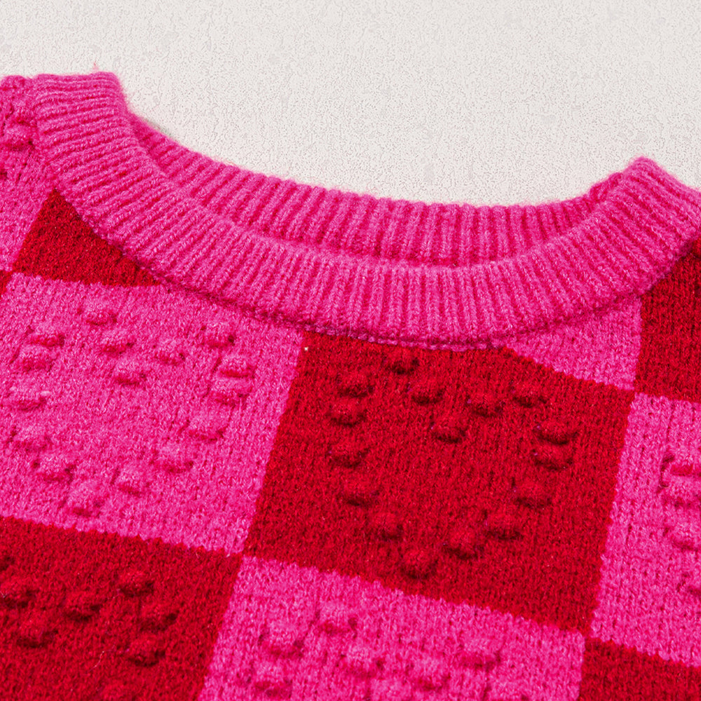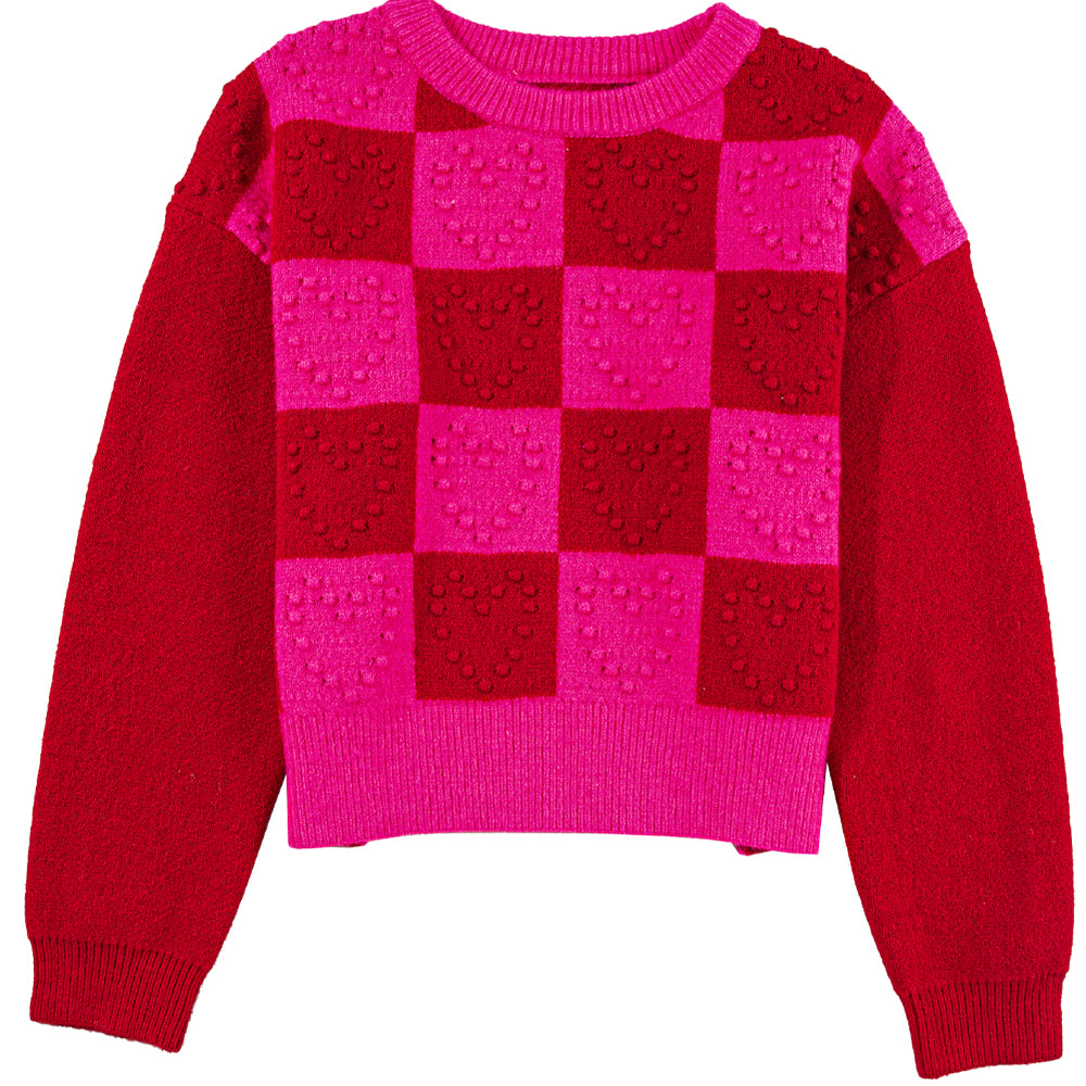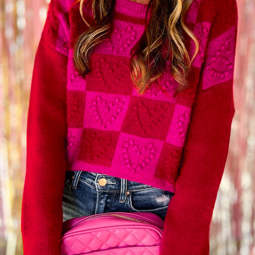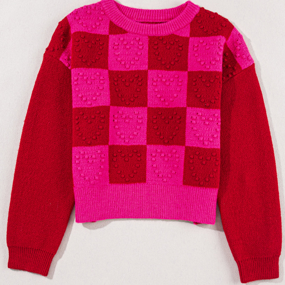 • Multicolor Checkered Pattern Heart Detail Textured Sweater