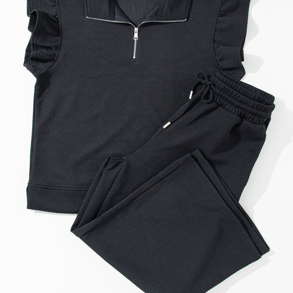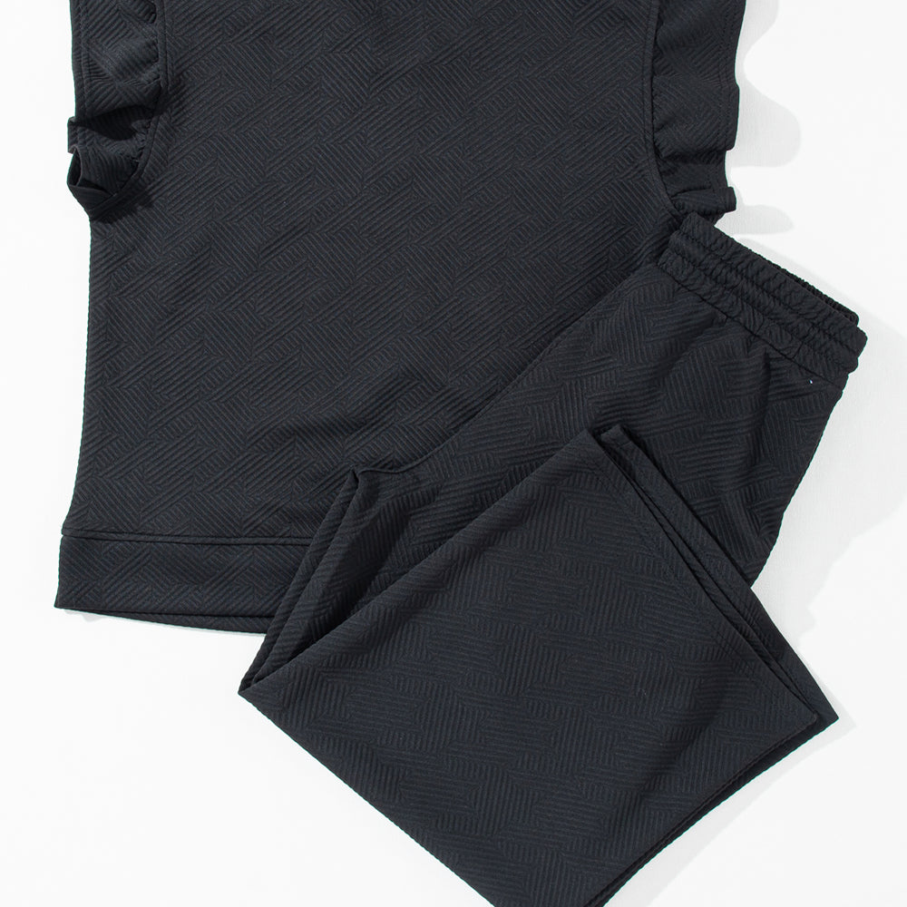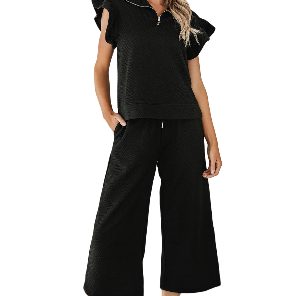 • Black Textured Flutter Sleeve Top Wide Leg Pants Set