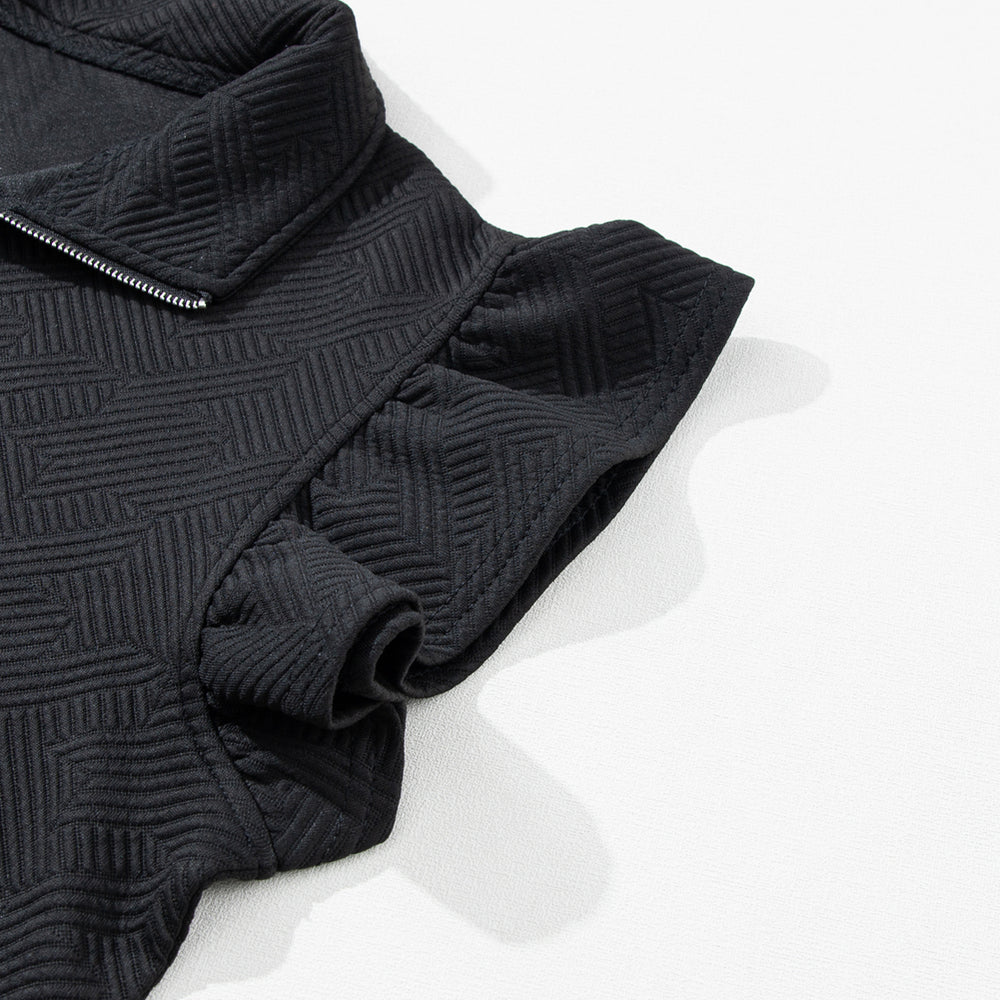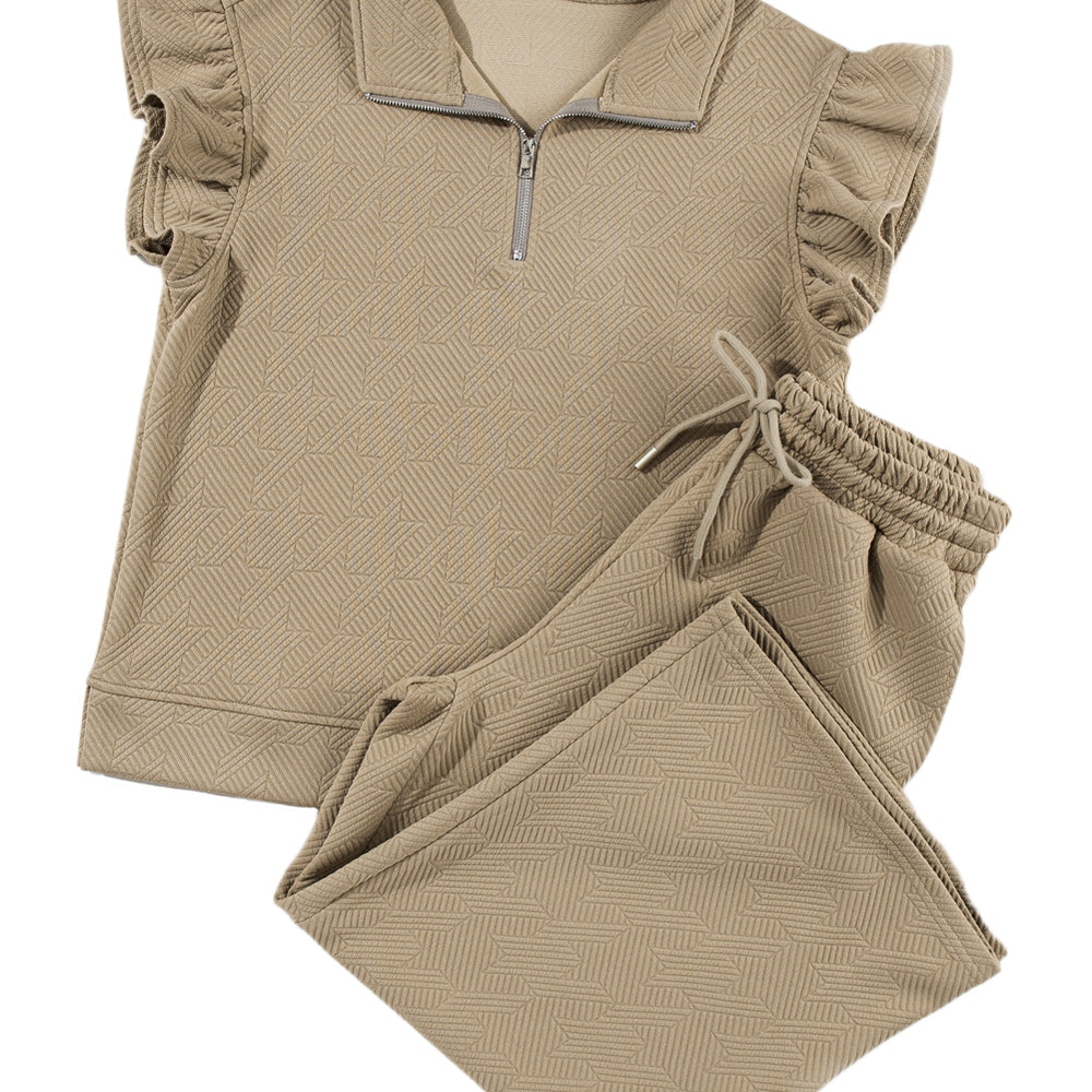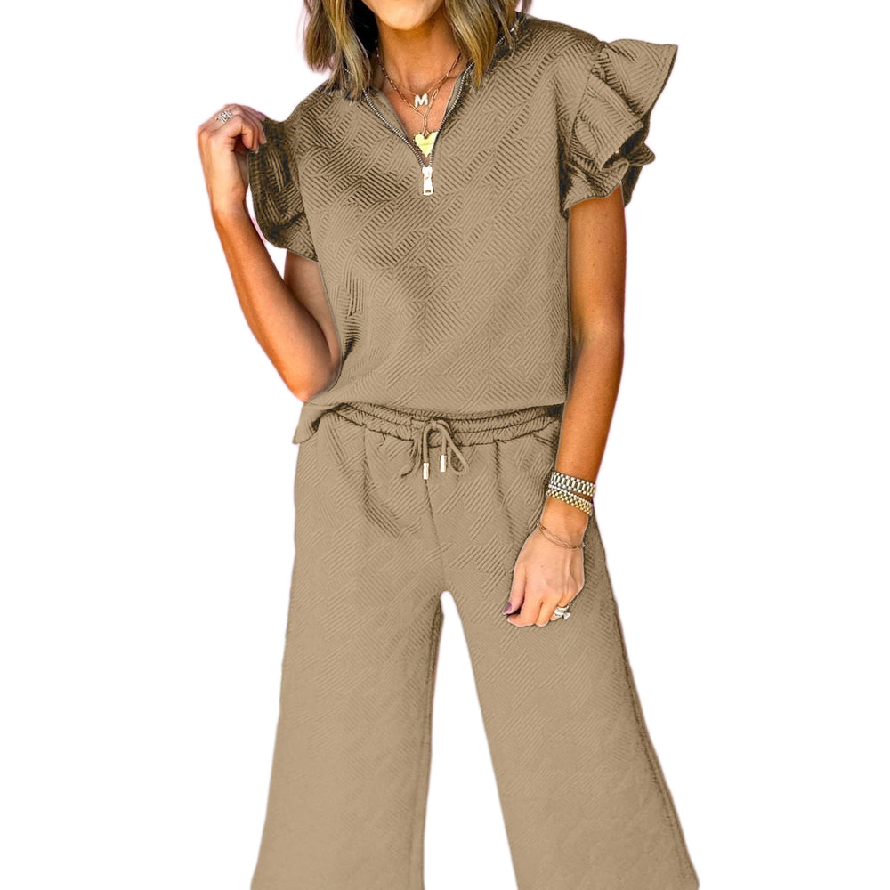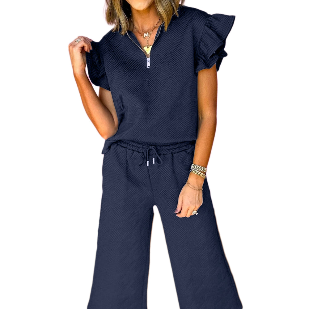 • Black Textured Flutter Sleeve Top Wide Leg Pants Set