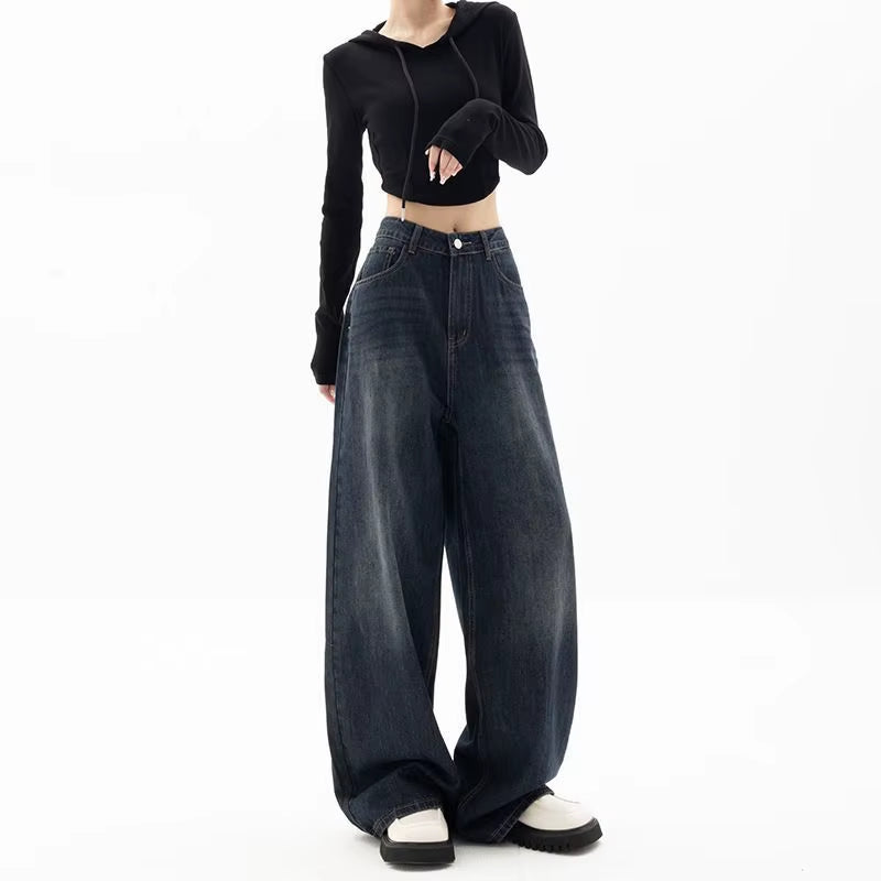 • Retro Street Style Wide Leg Pants Niche Design Floor Length Pants High Waisted Loose Fit Slimming Jeans for Women