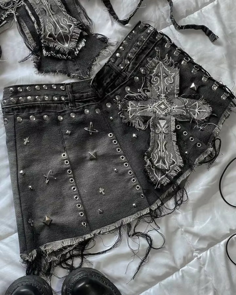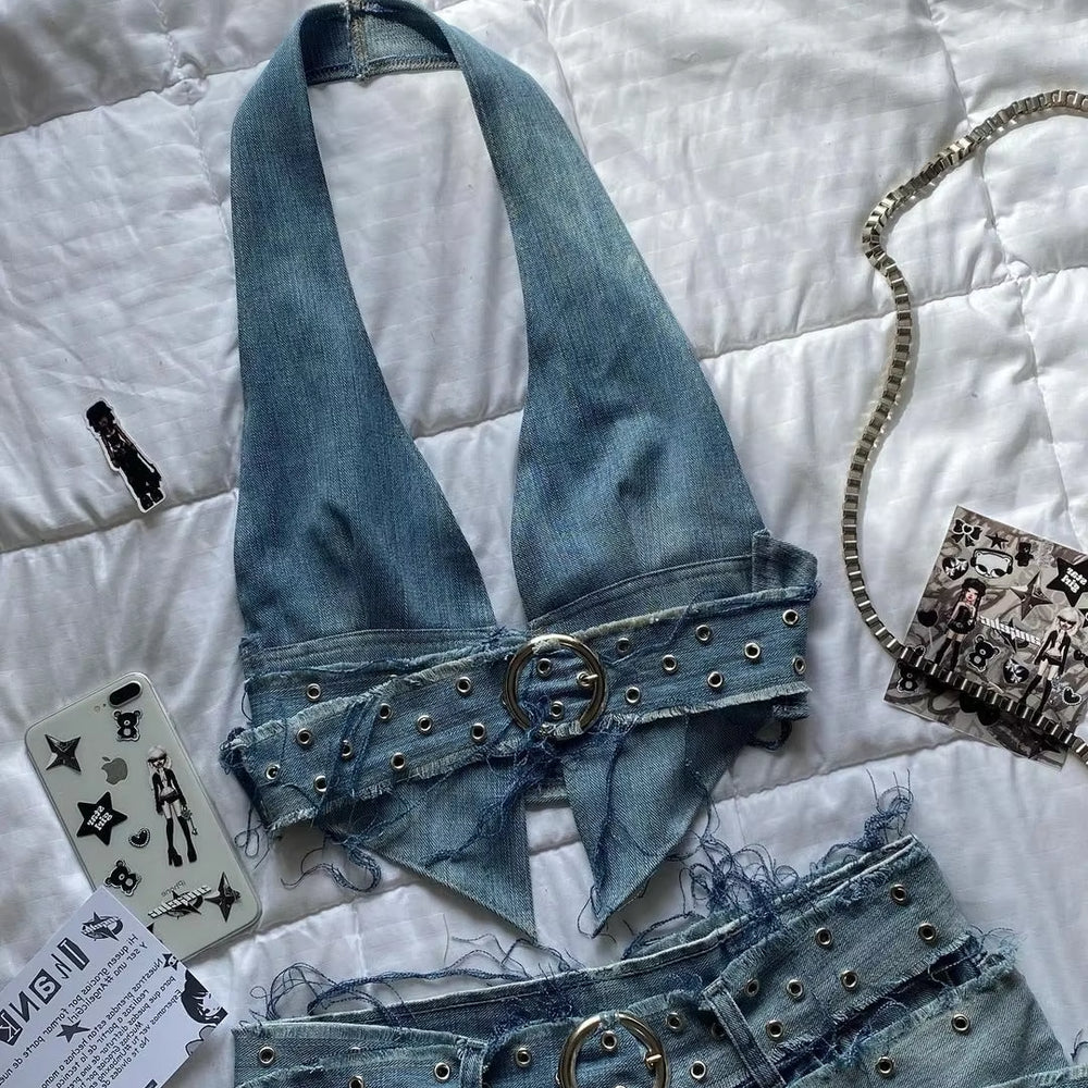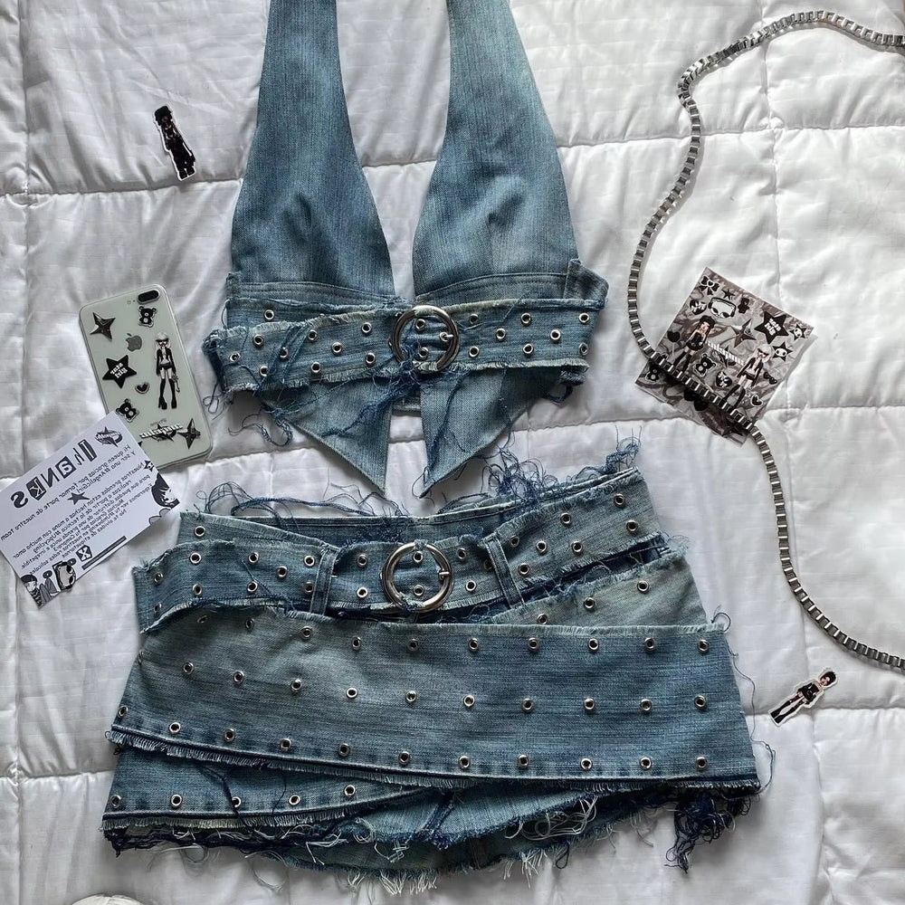 • Gothic Skirt Two Piece Sets Womens Y2K Clothing Sexy Hot Sweetheart Harajuku Bow Retro Blue Denim Skirt Slim Strap Top Tops Set