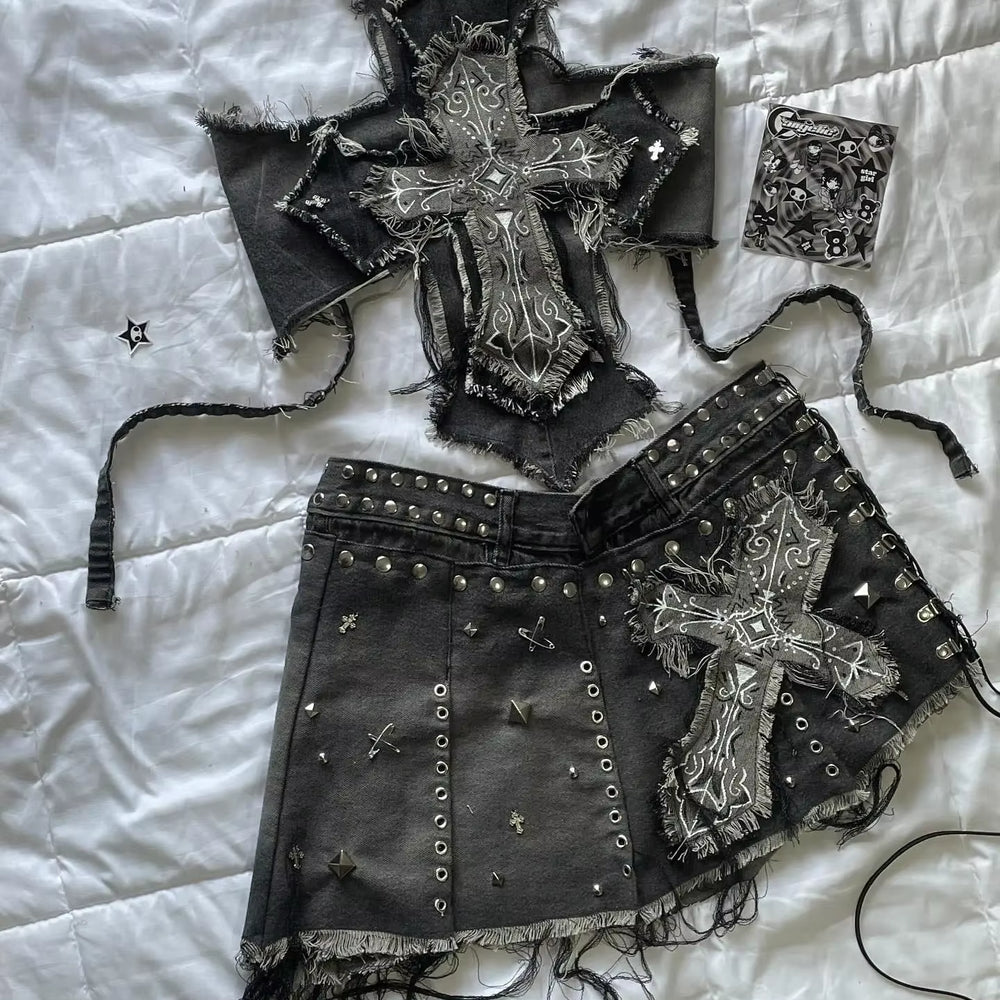 Gothic Skirt Two Piece Sets Womens Y2K Clothing Sexy Hot Sweetheart Harajuku Bow Retro Blue Denim Skirt Slim Strap Top Tops Set