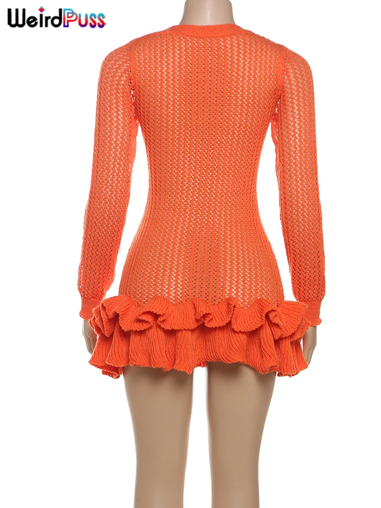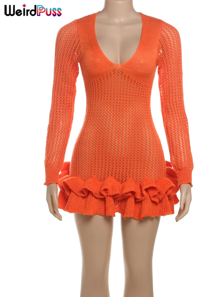 Crochet Women Dress See through Sexy Tierred Hem 2024 Fall Trend Hipster Deep V-Neck Stretch Y2K Chic Mini Bodycon