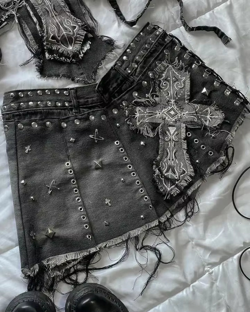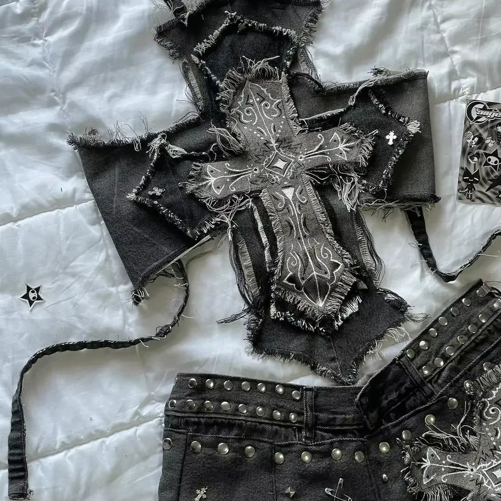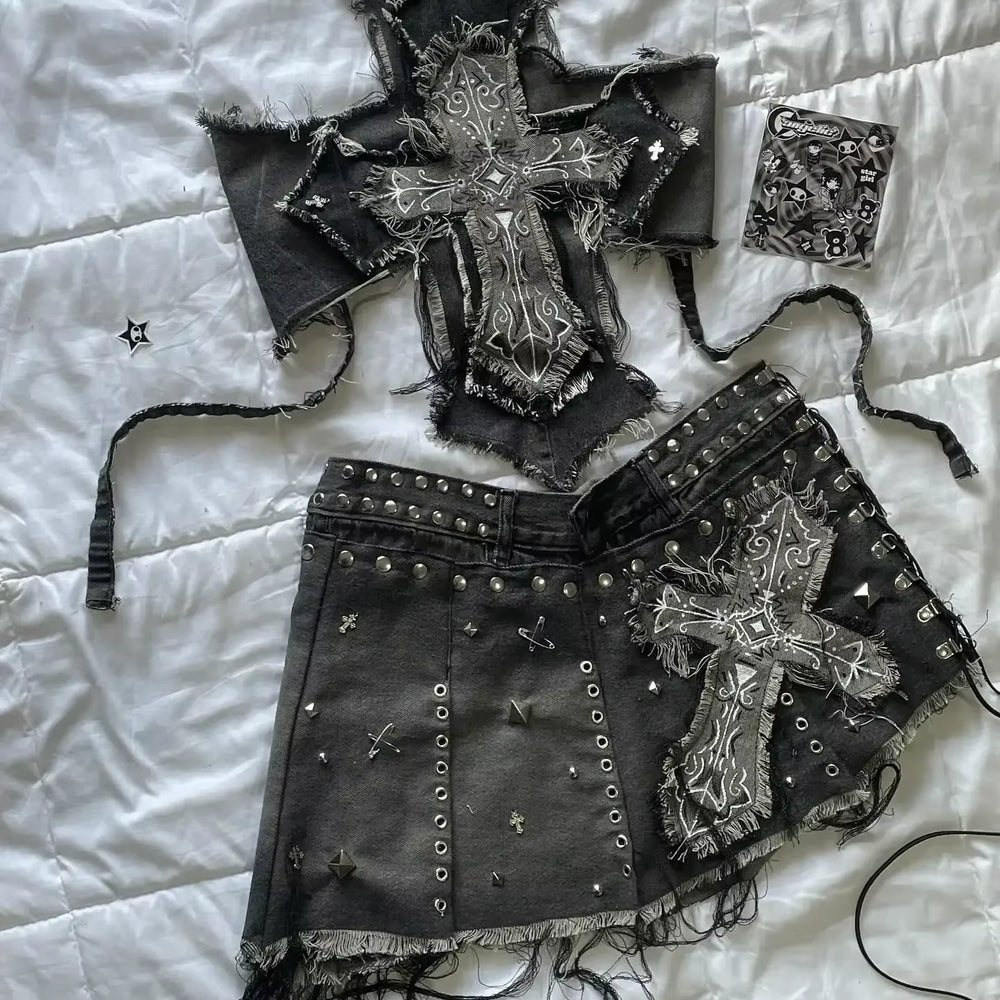 Harajuku Fashion Denim Two Piece Set Y2K Women Sweetheart Light Blue Bow Sleeveless Tube Top Camisole Lace Hip Mini Skirt Set