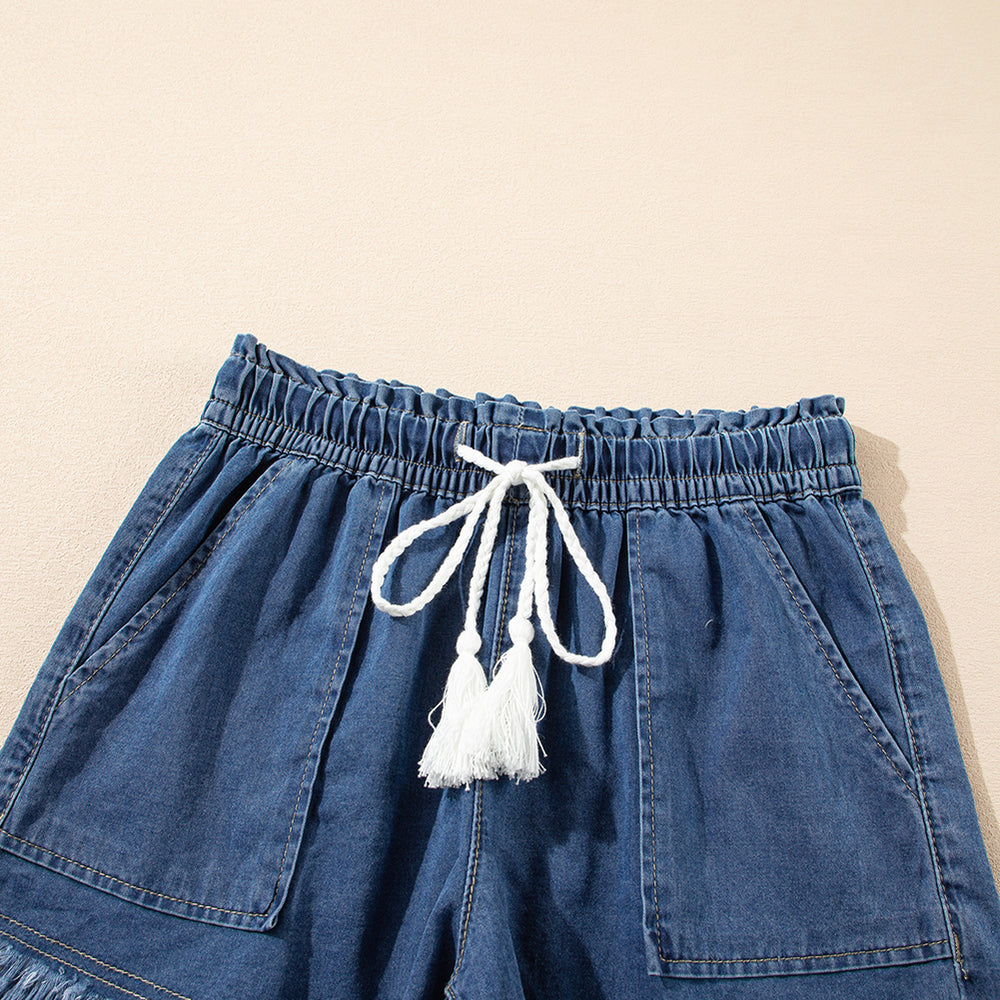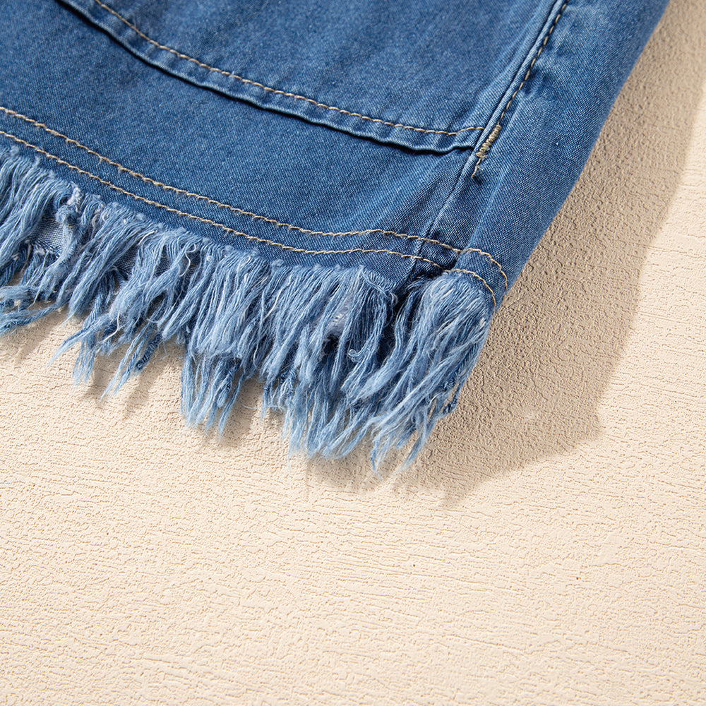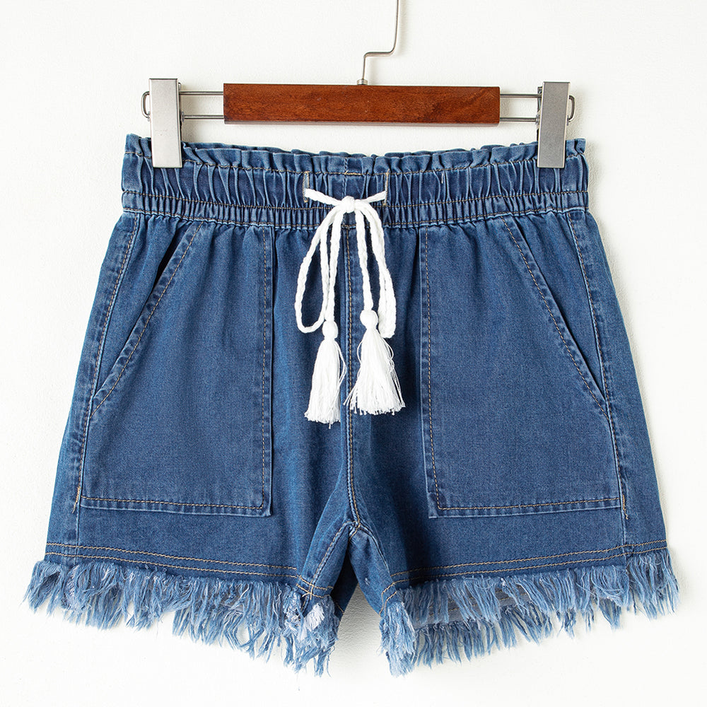 Convenient side seam pockets and cute raw fringe bottom edge finished.