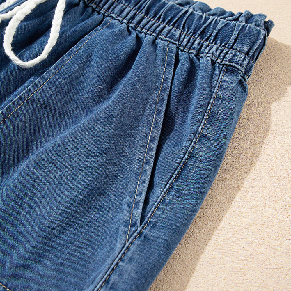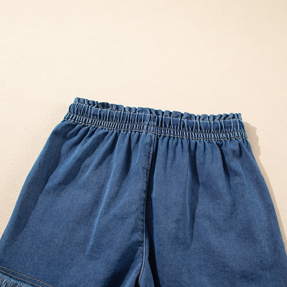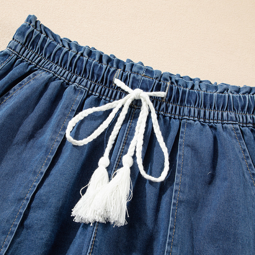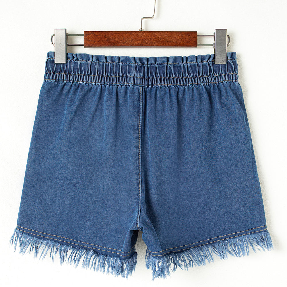 Convenient side seam pockets and cute raw fringe bottom edge finished.