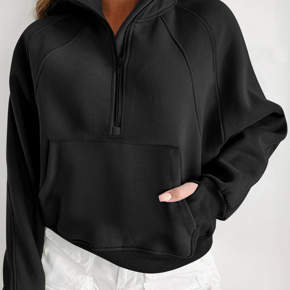 • Black Fleece Lined Zip Up Stand Collar Thumbhole Sleeve Sweatshirt