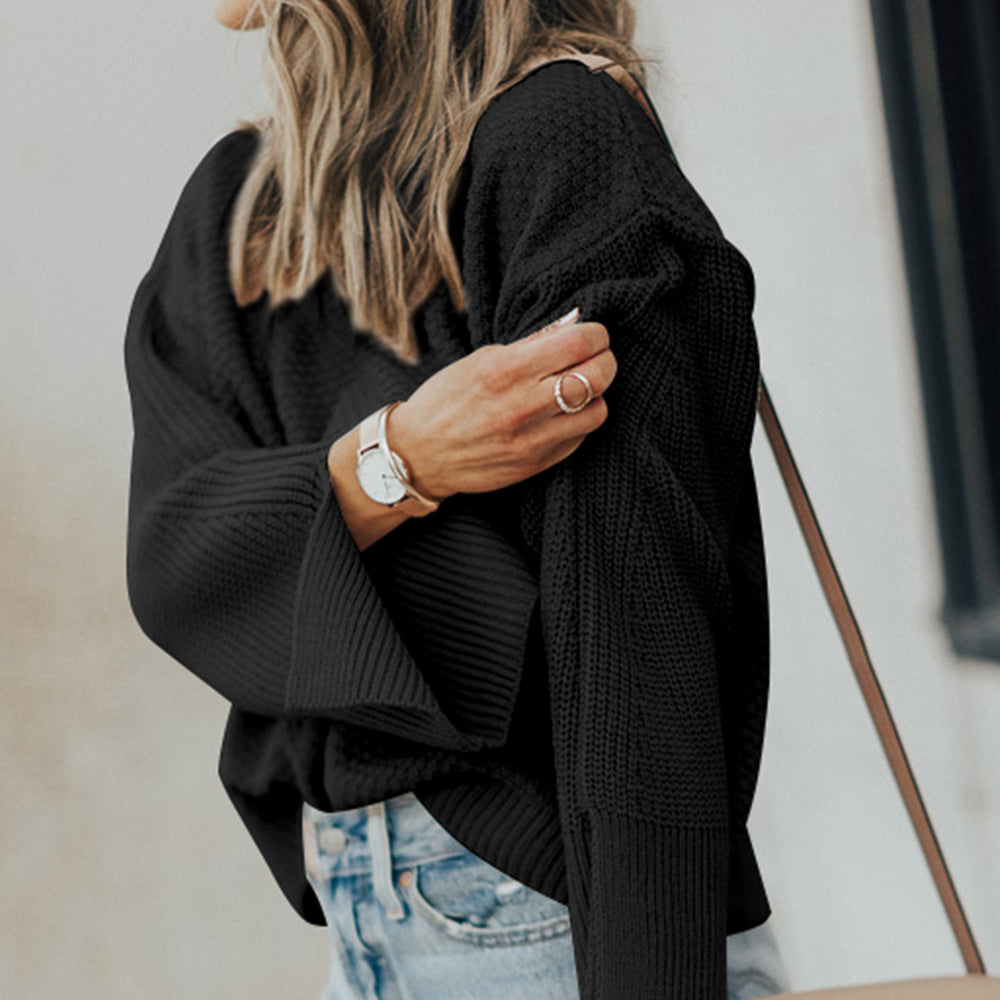 • Black Solid Textured Knit Split Cuff Drop Shoulder Loose Sweater