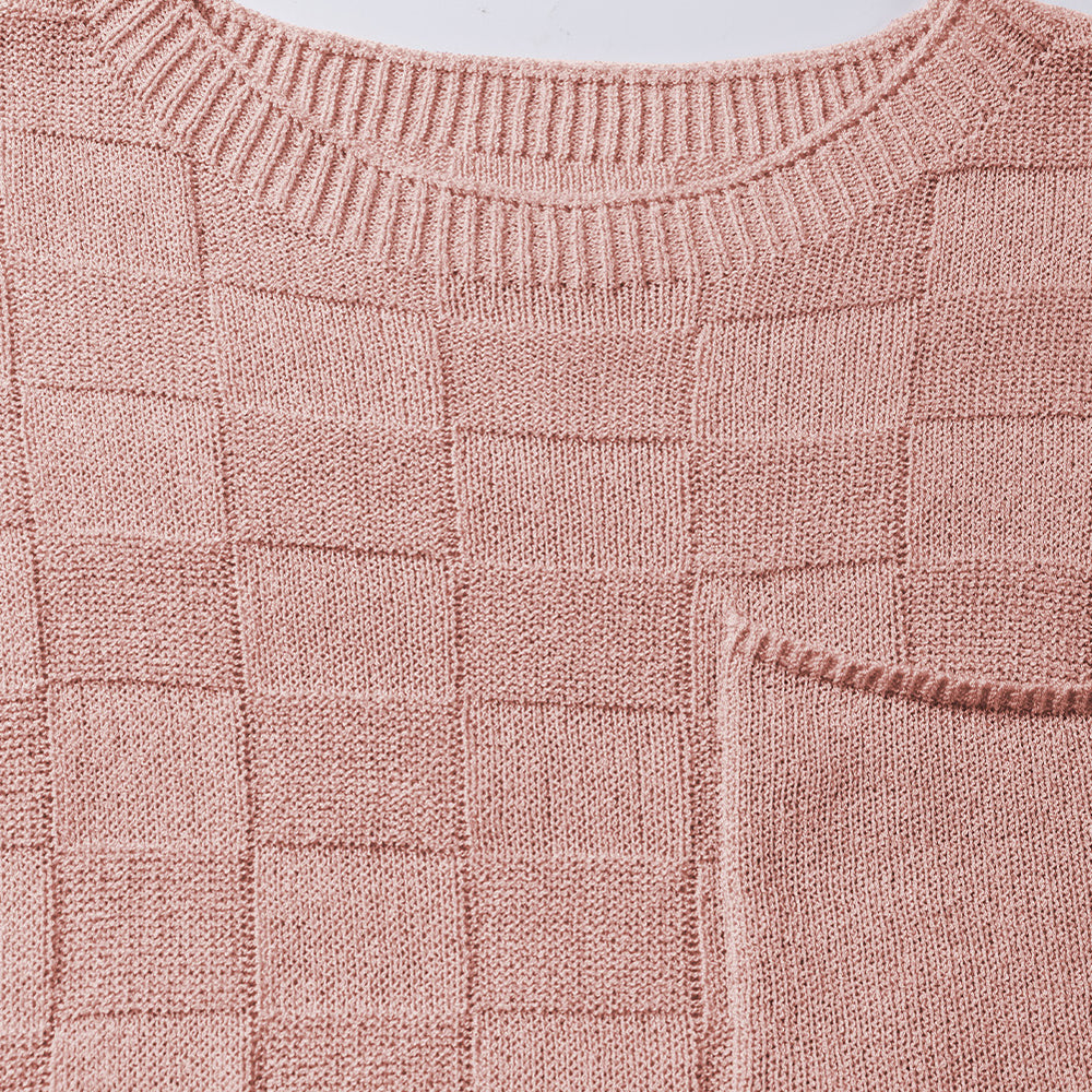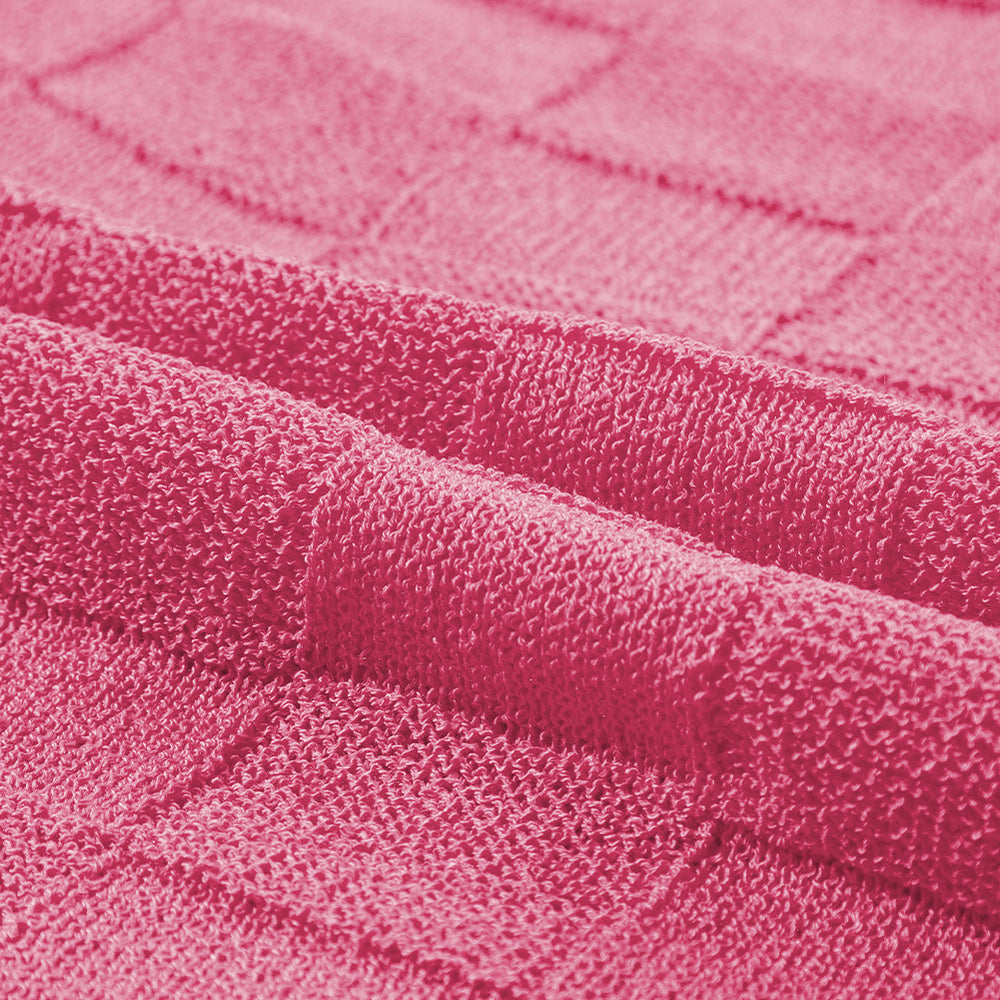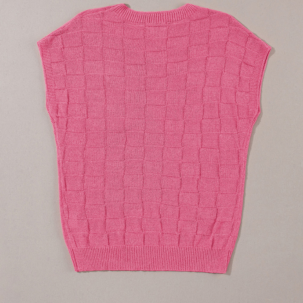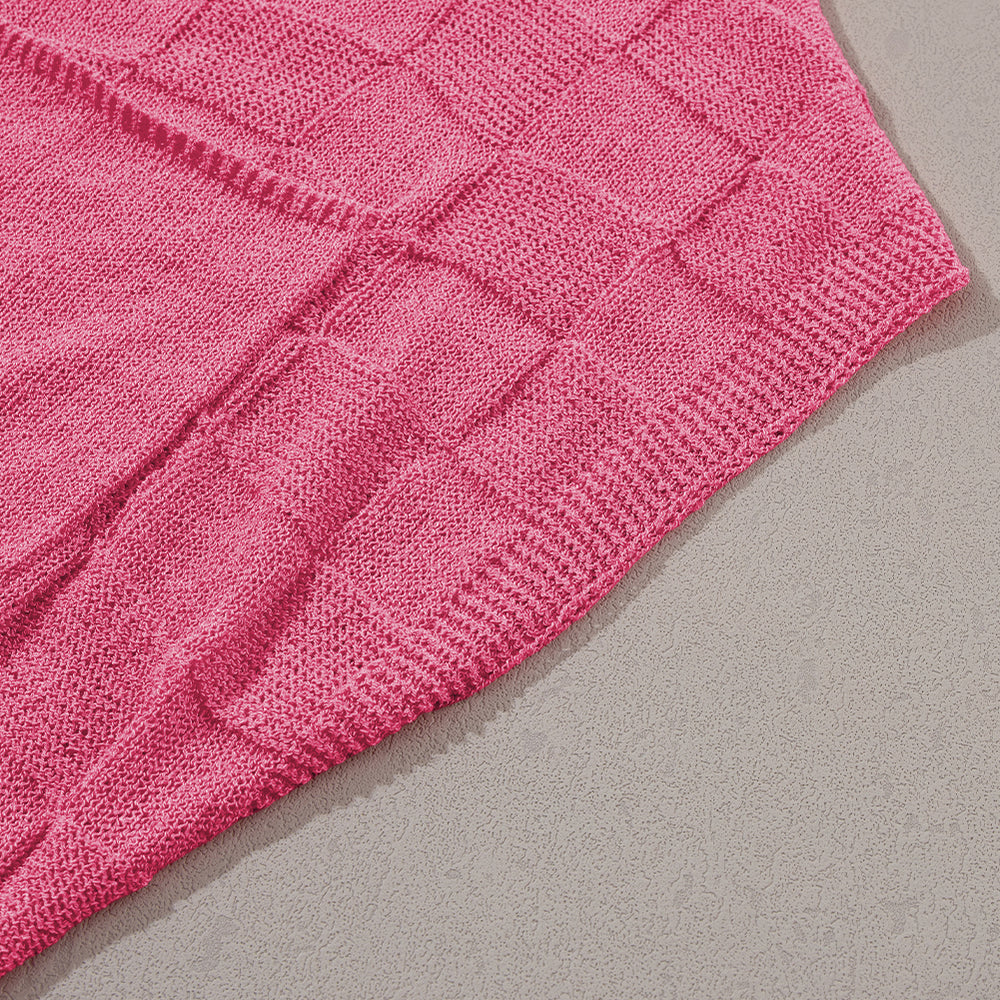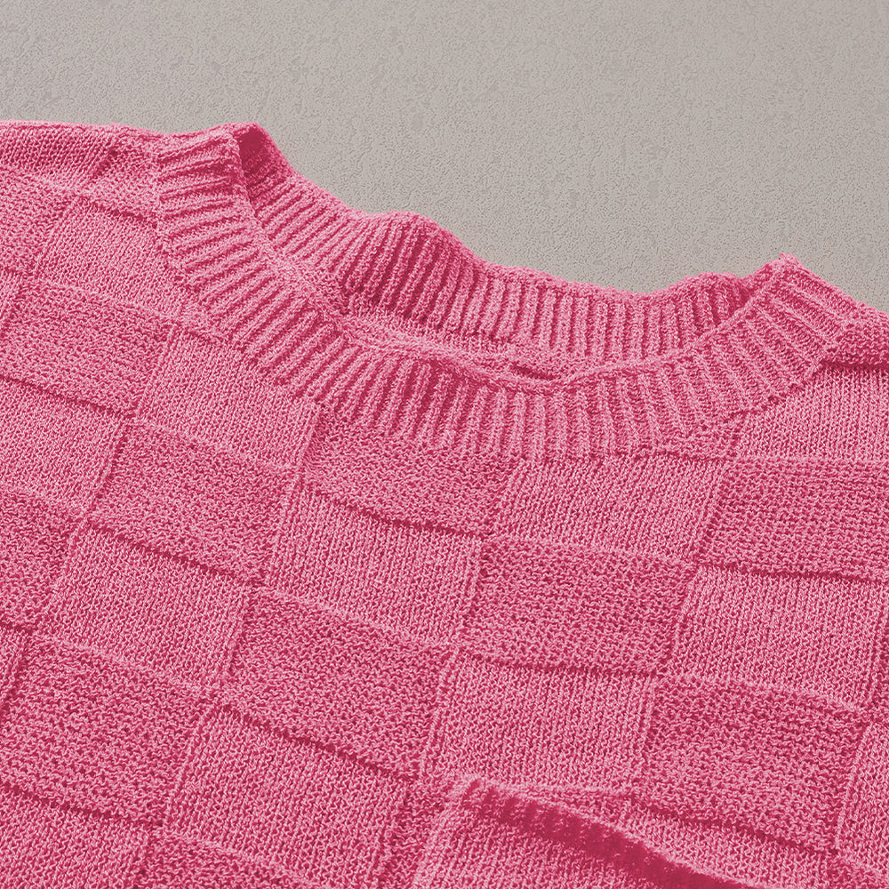 • Bright Pink Lattice Textured Knit Short Sleeve Sweater