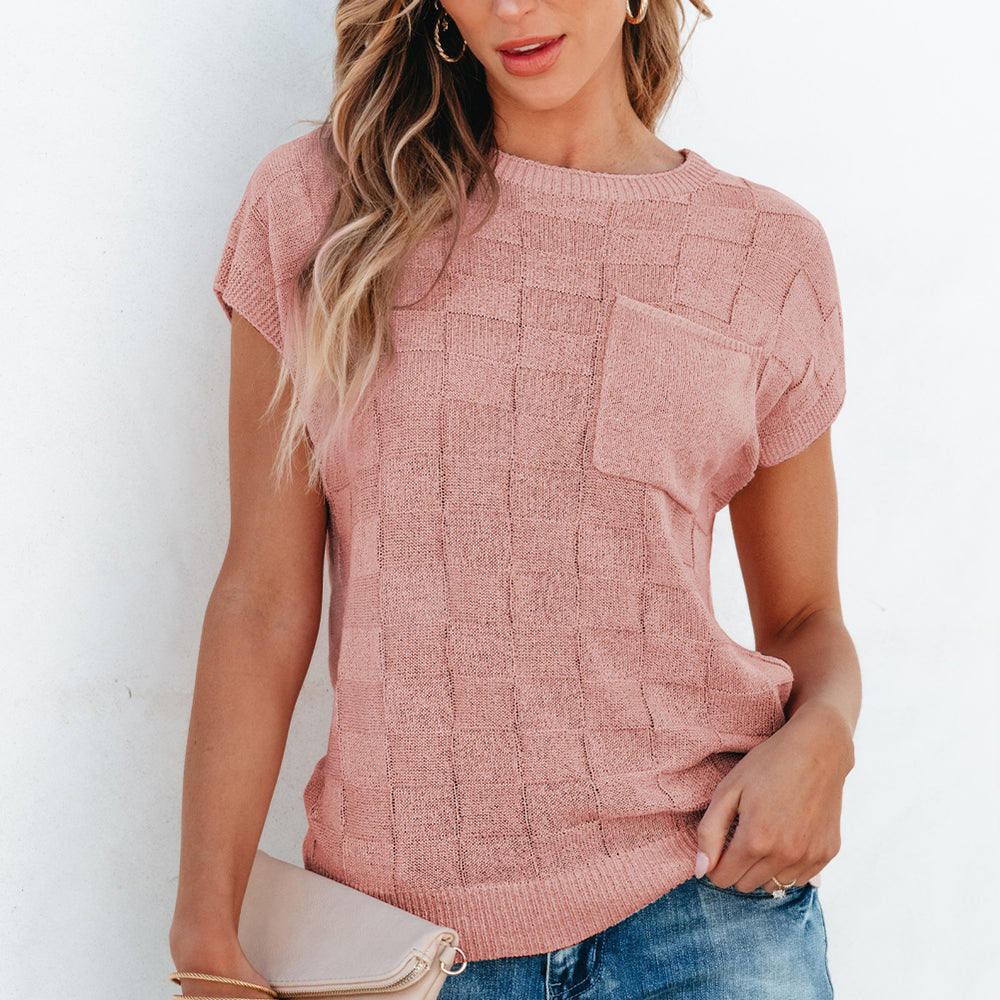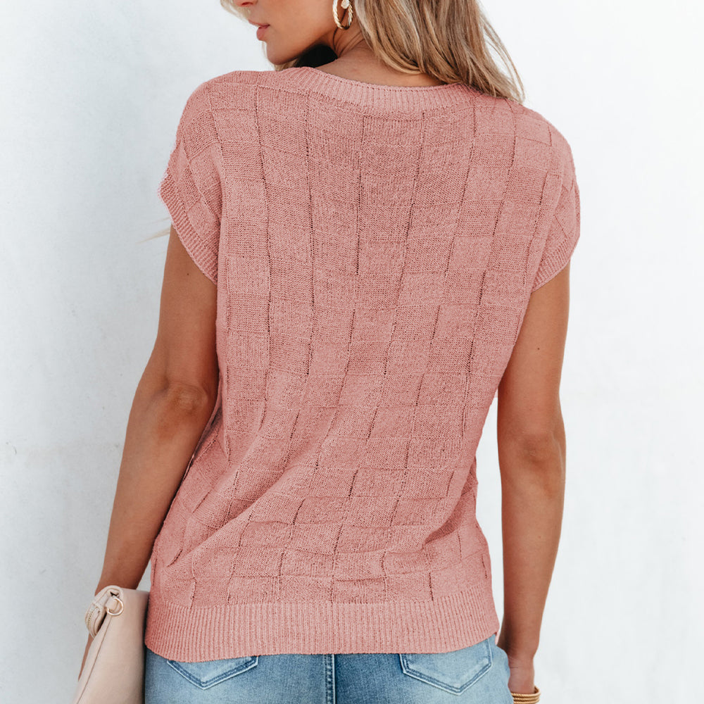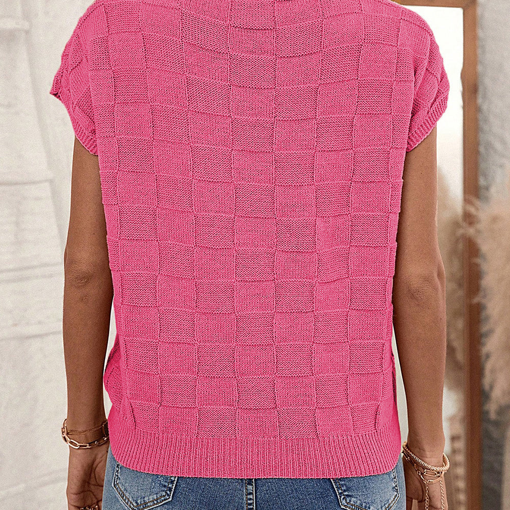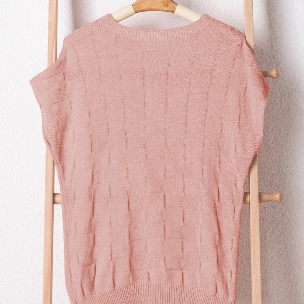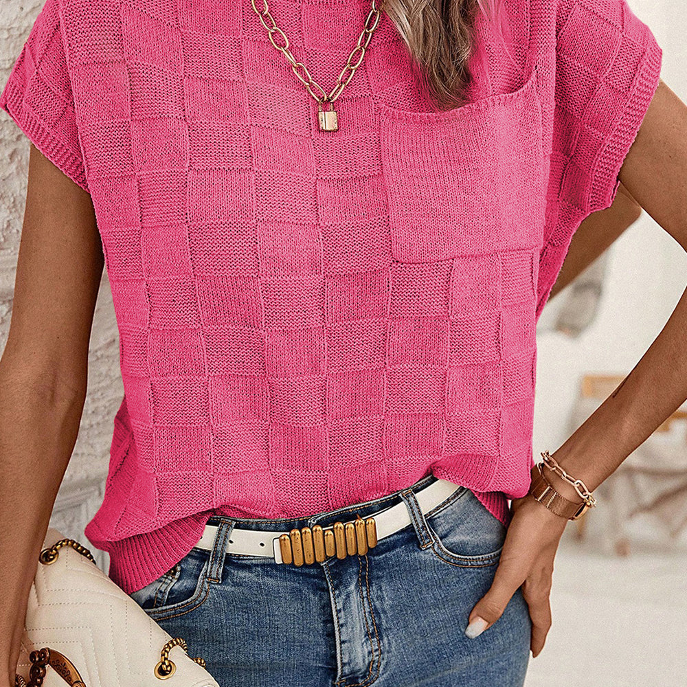 • Bright Pink Lattice Textured Knit Short Sleeve Sweater