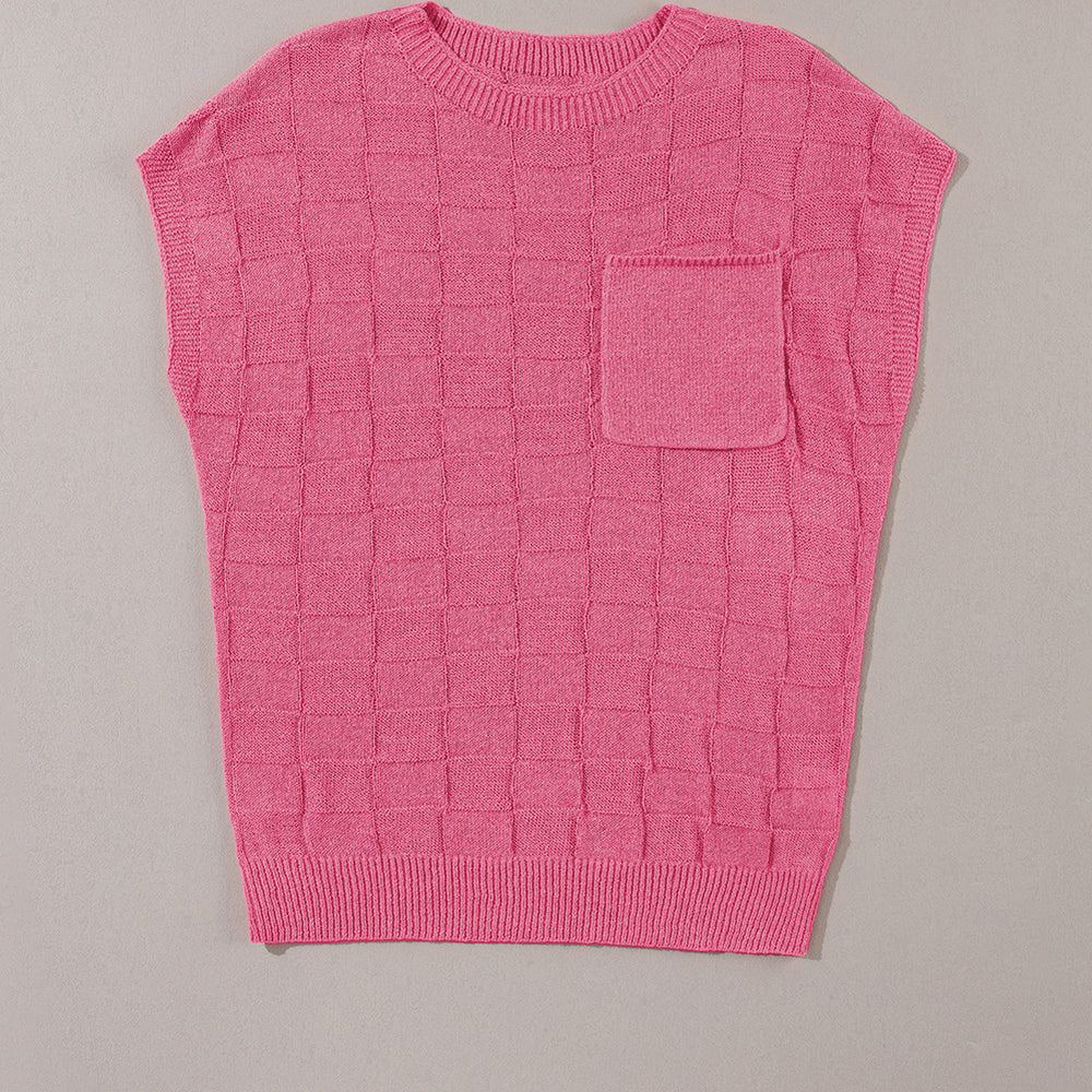 Bright Pink Lattice Textured Knit Short Sleeve Sweater
