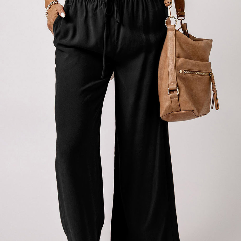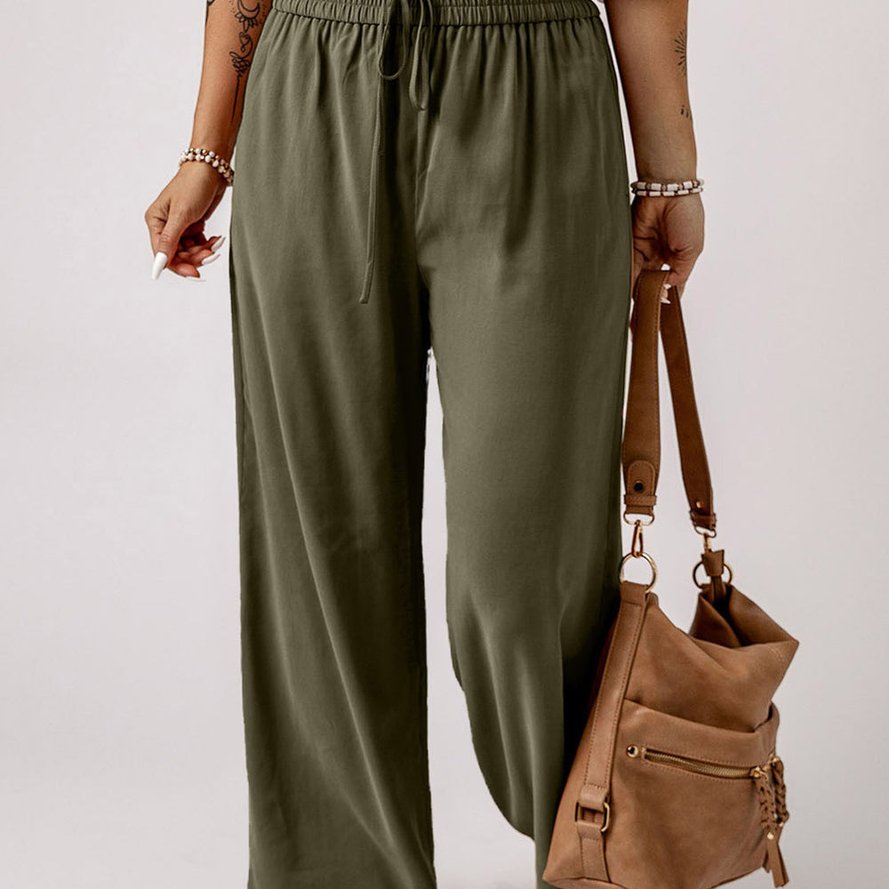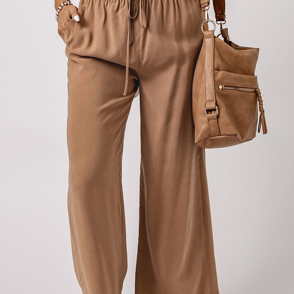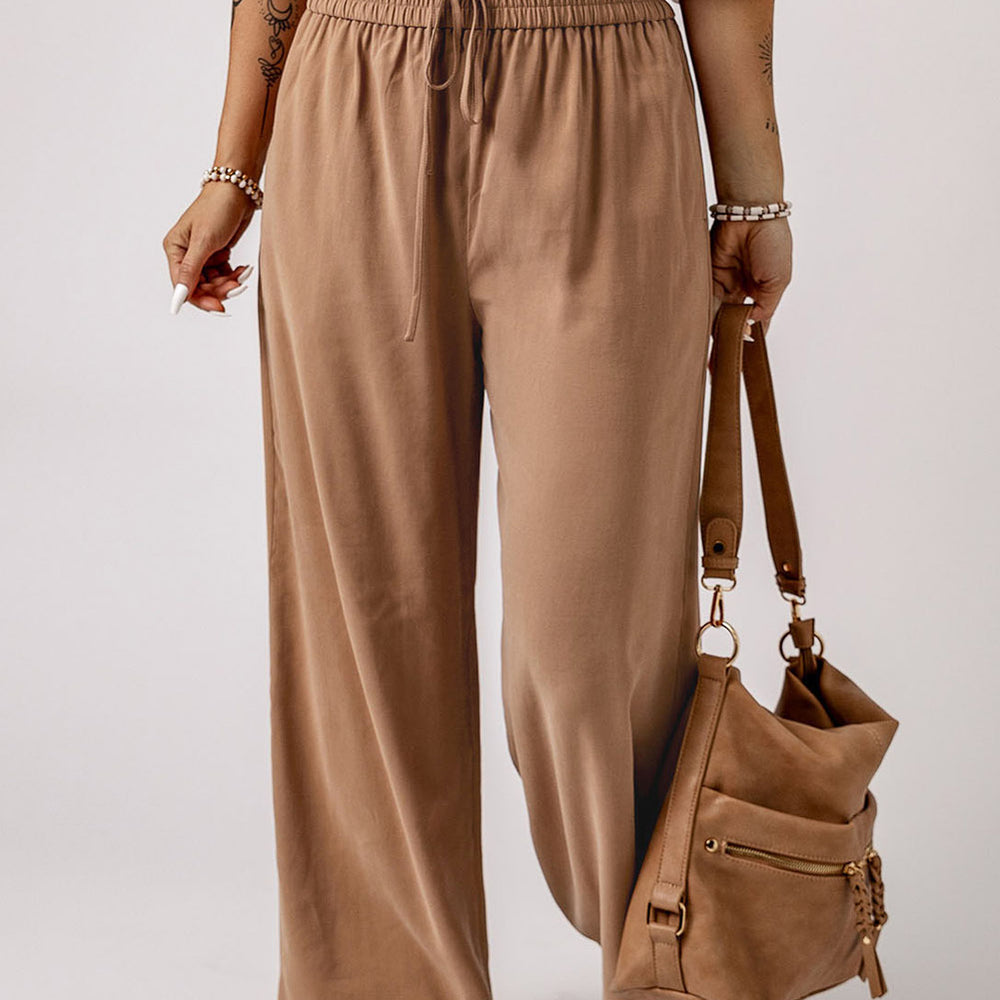• Brown Drawstring Elastic Waist Casual Wide Leg Pants