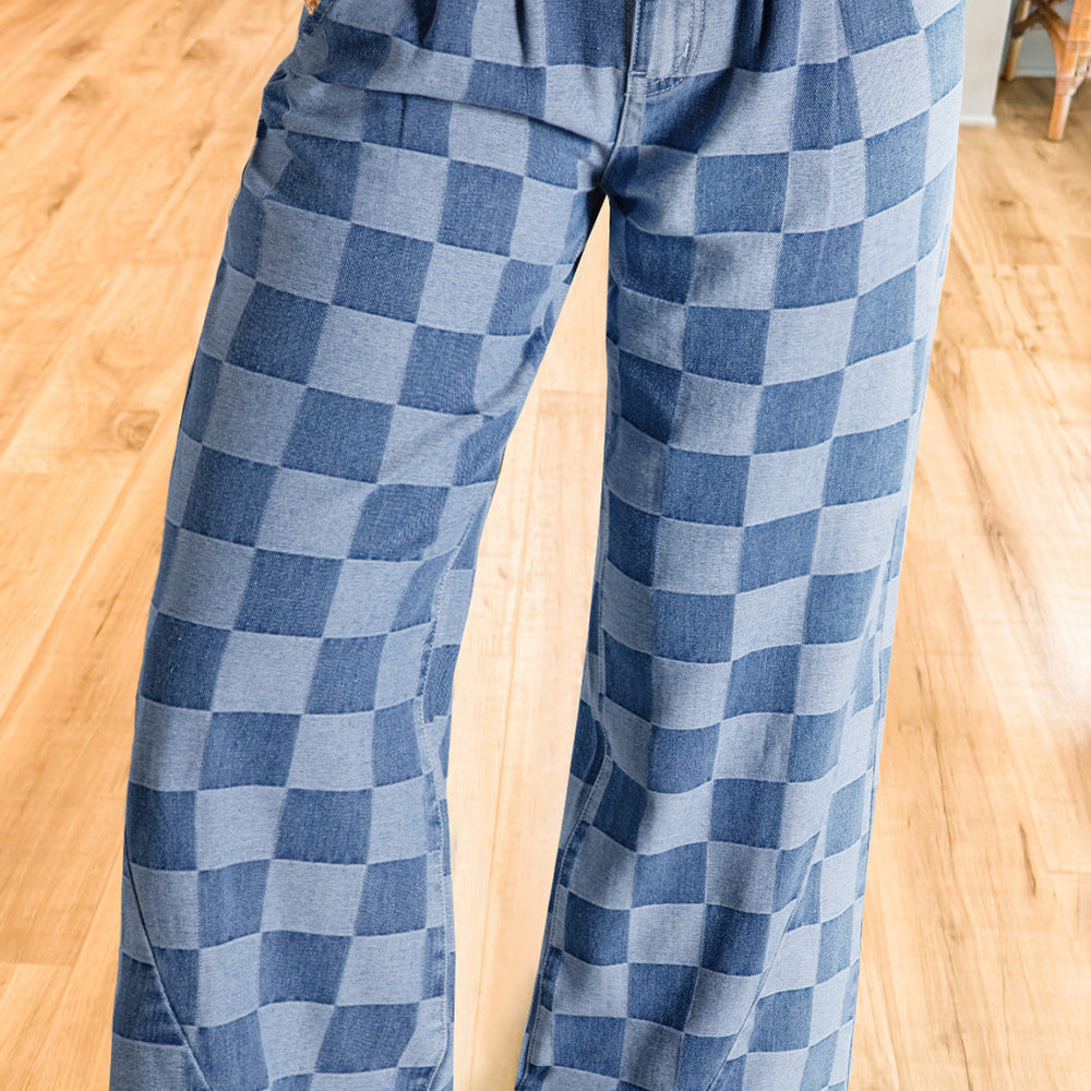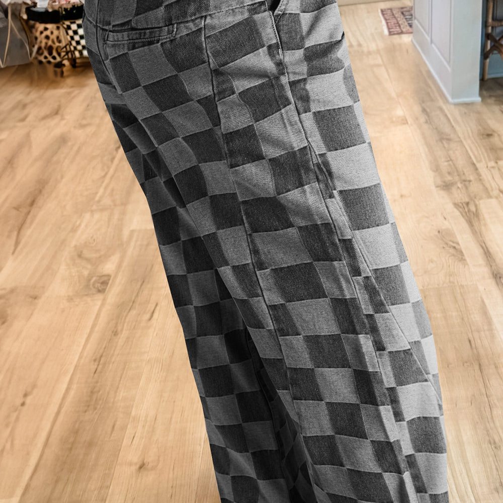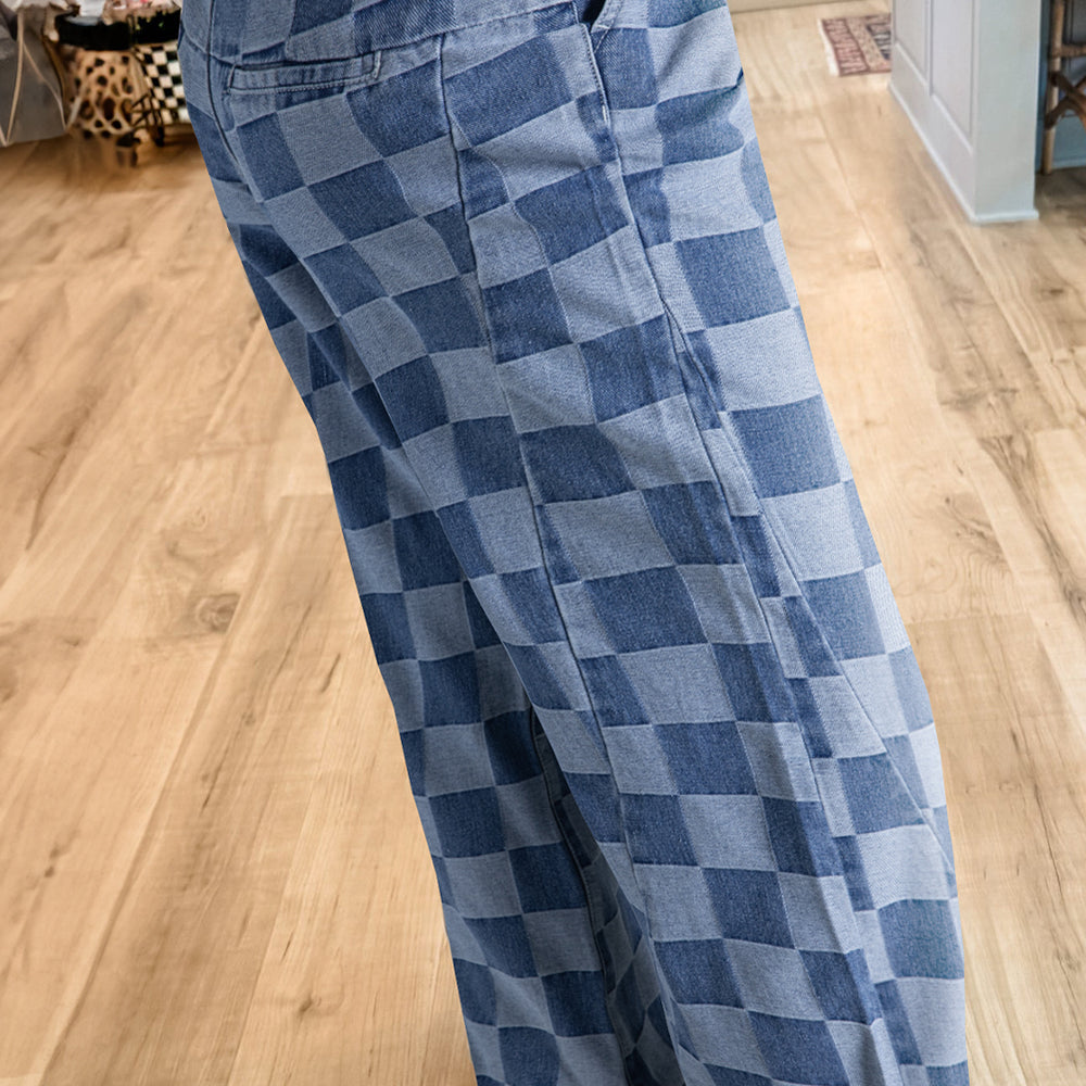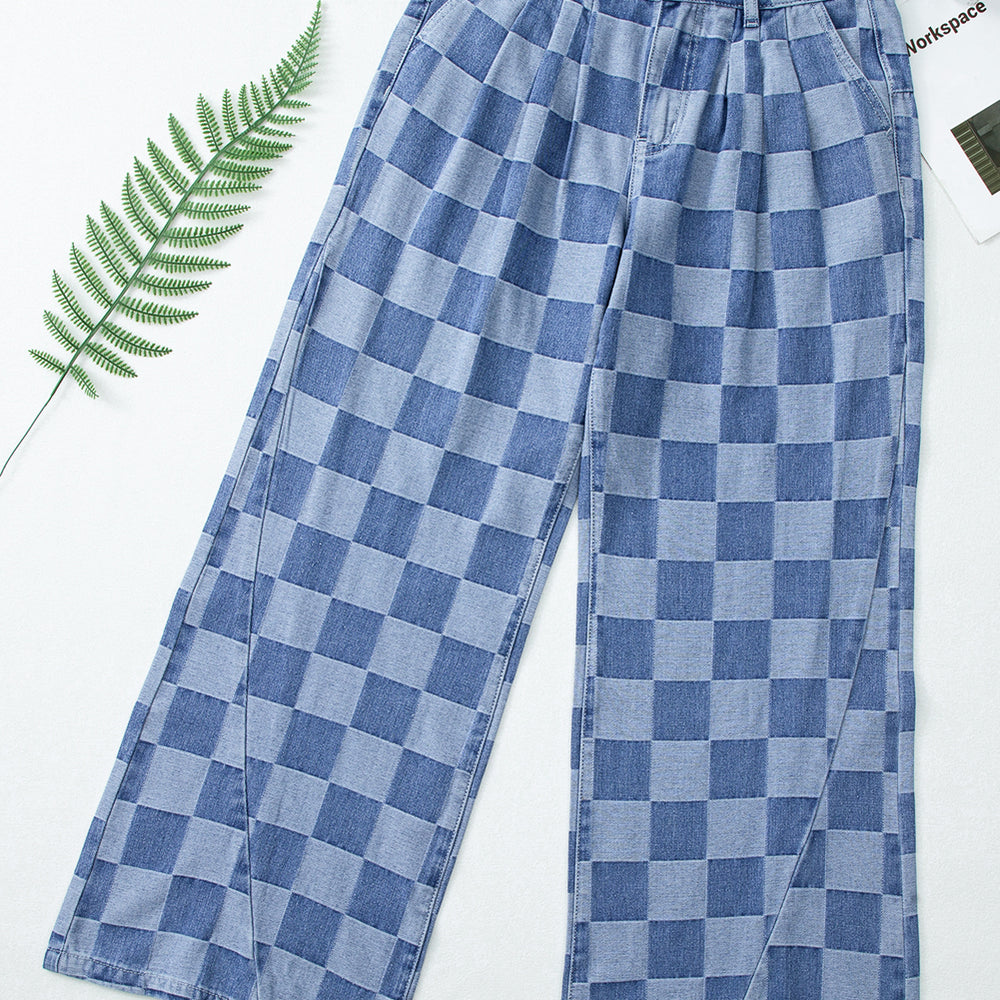 - These jeans showcase a distinctive checkered pattern that brings a classic and stylish look.