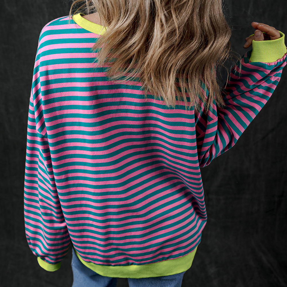 • Green Stripe Oversized Contrast Trim Pullover Sweatshirt