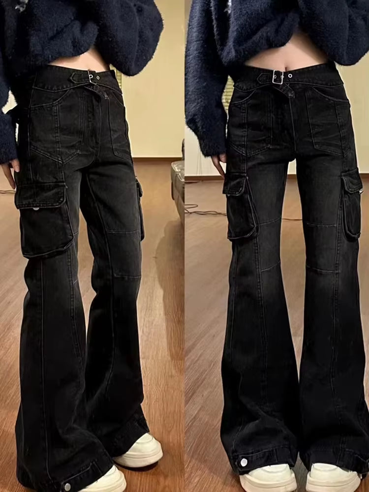 High Street Office Lady Black Flare Jeans Slim Bell Bottoms Gyaru Fashion Denim Trousers Multiple Pockets 2000S American Retro