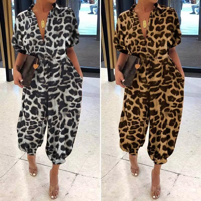 • Leopard Printed Jumpsuit Women 2023 Summer New Short Sleeves Leace-Up Pocket Casual Jumpsuits Fashion Vintage Ladies Bodysuits