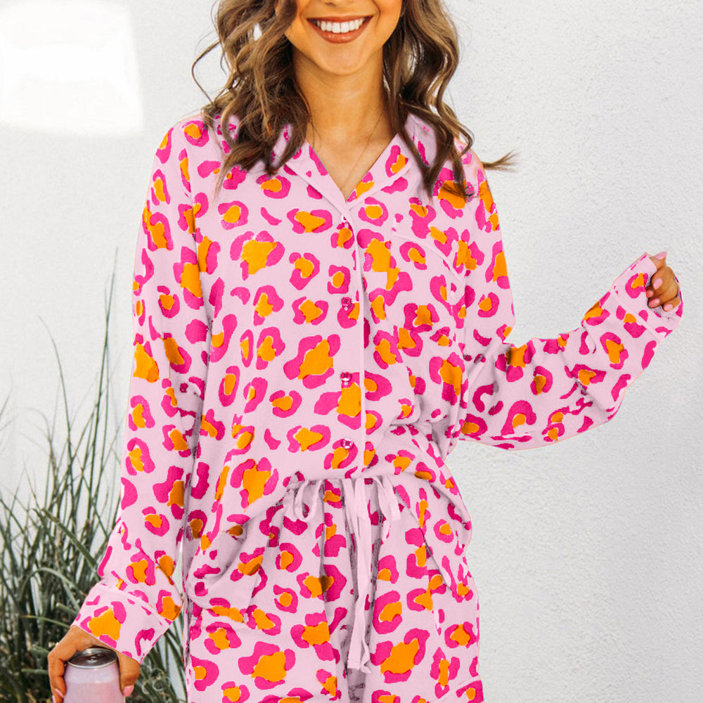 Orange Leopard Print Long Sleeve Shirt and Shorts Pajama Set