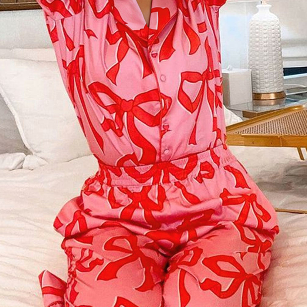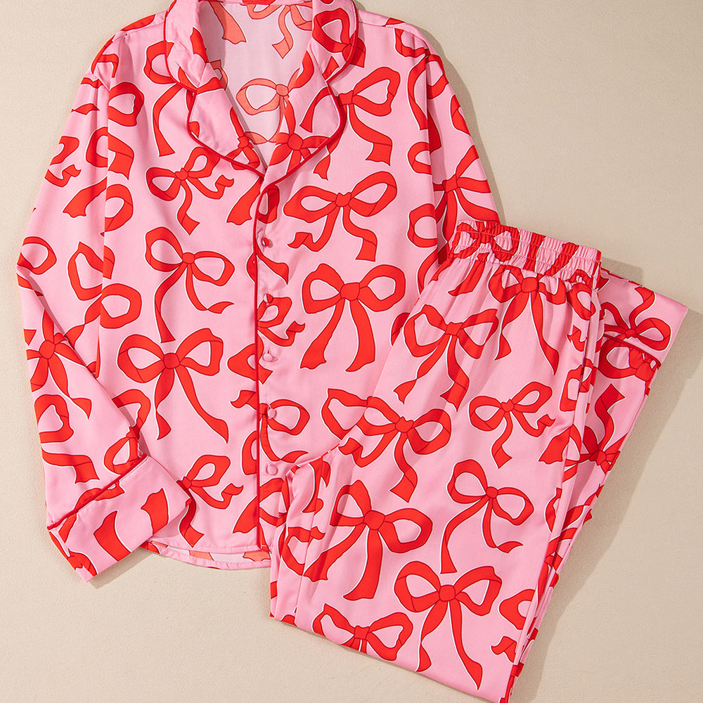 • Pink 2pcs Bow Print Shirt Style Long Sleeve Pajama Set