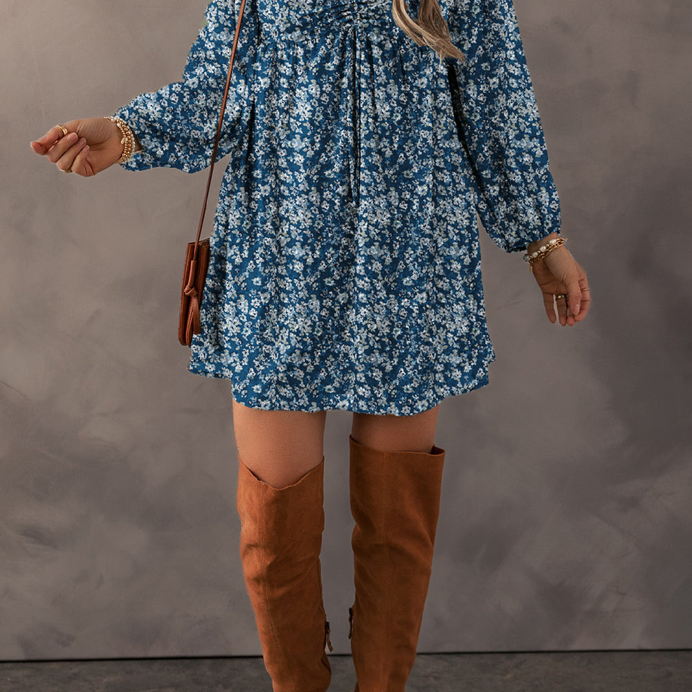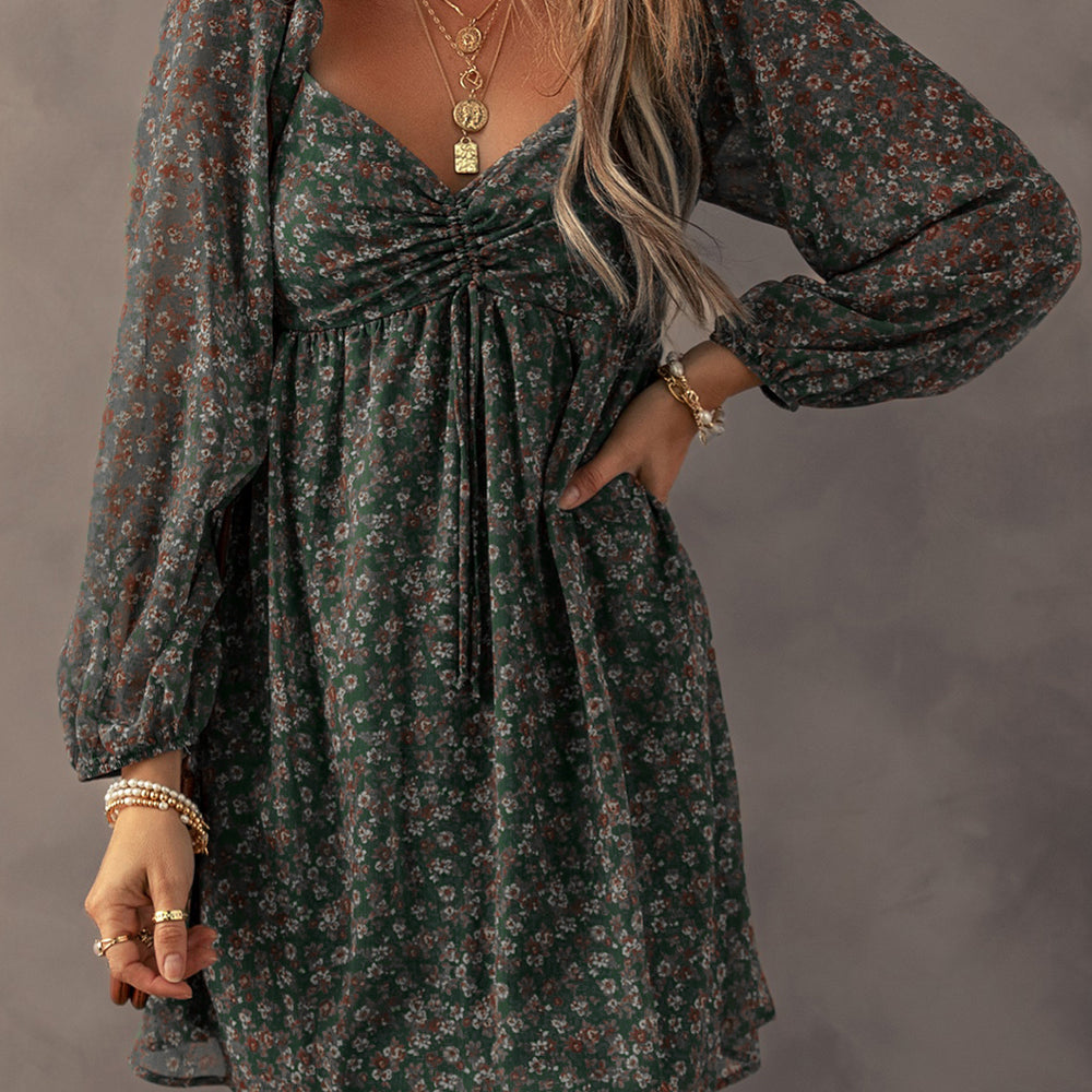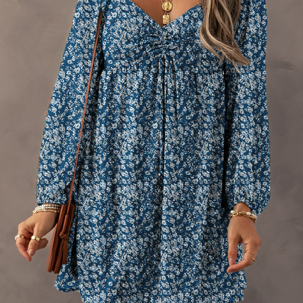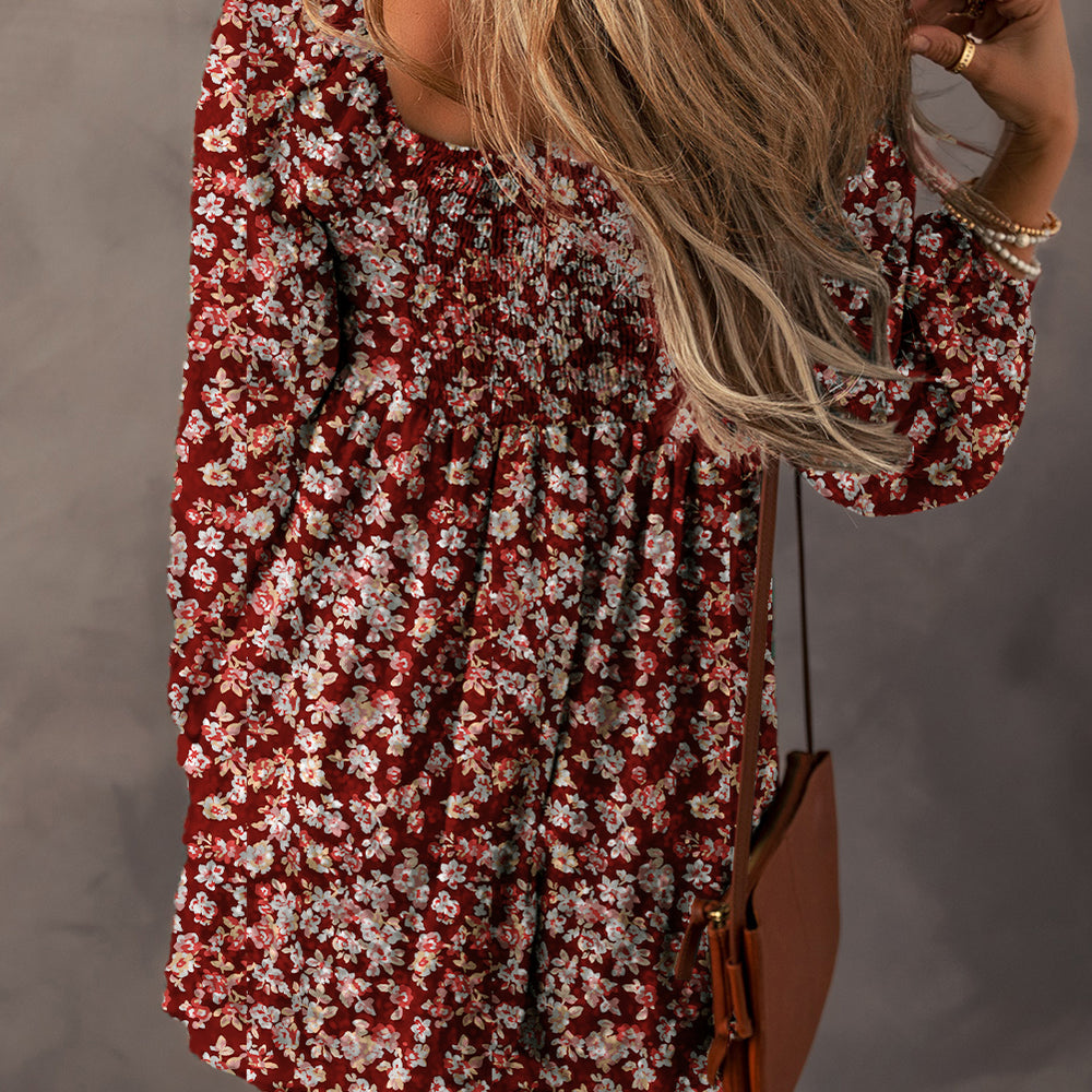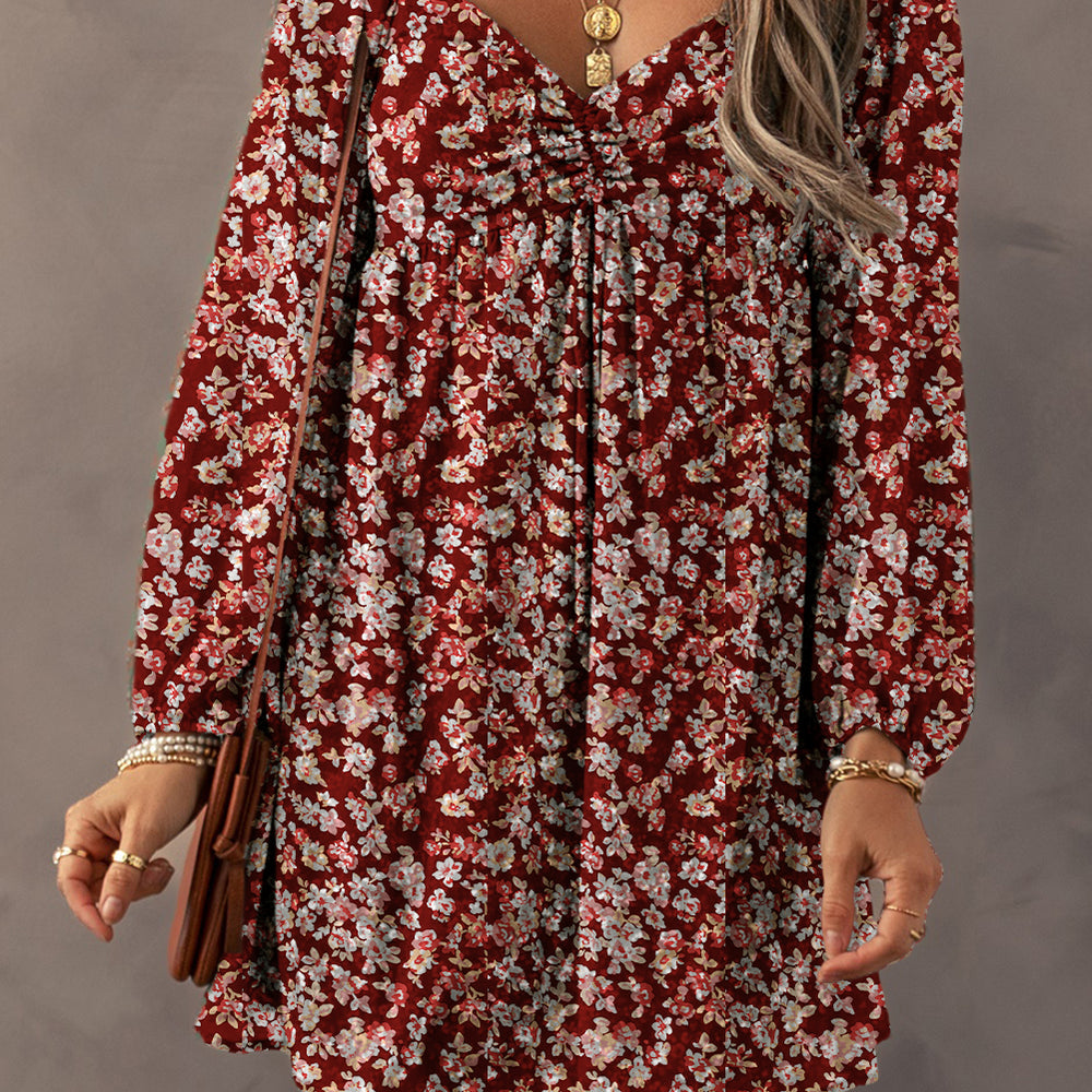 • Red Floral Print Sweetheart Neck Shirred Back Mini Dress