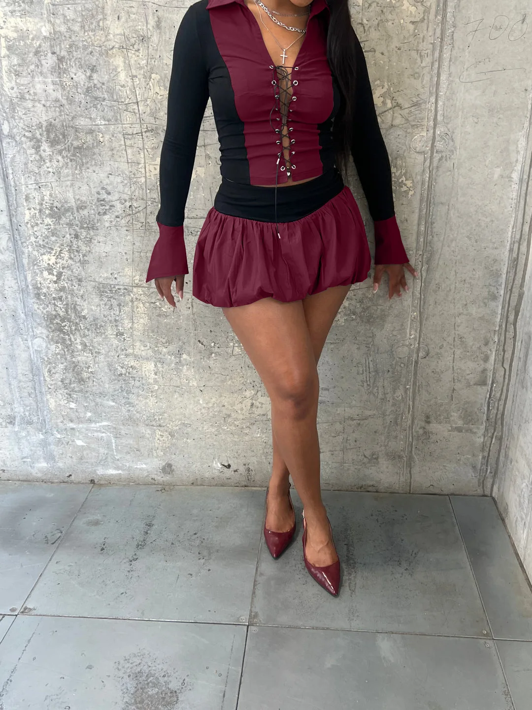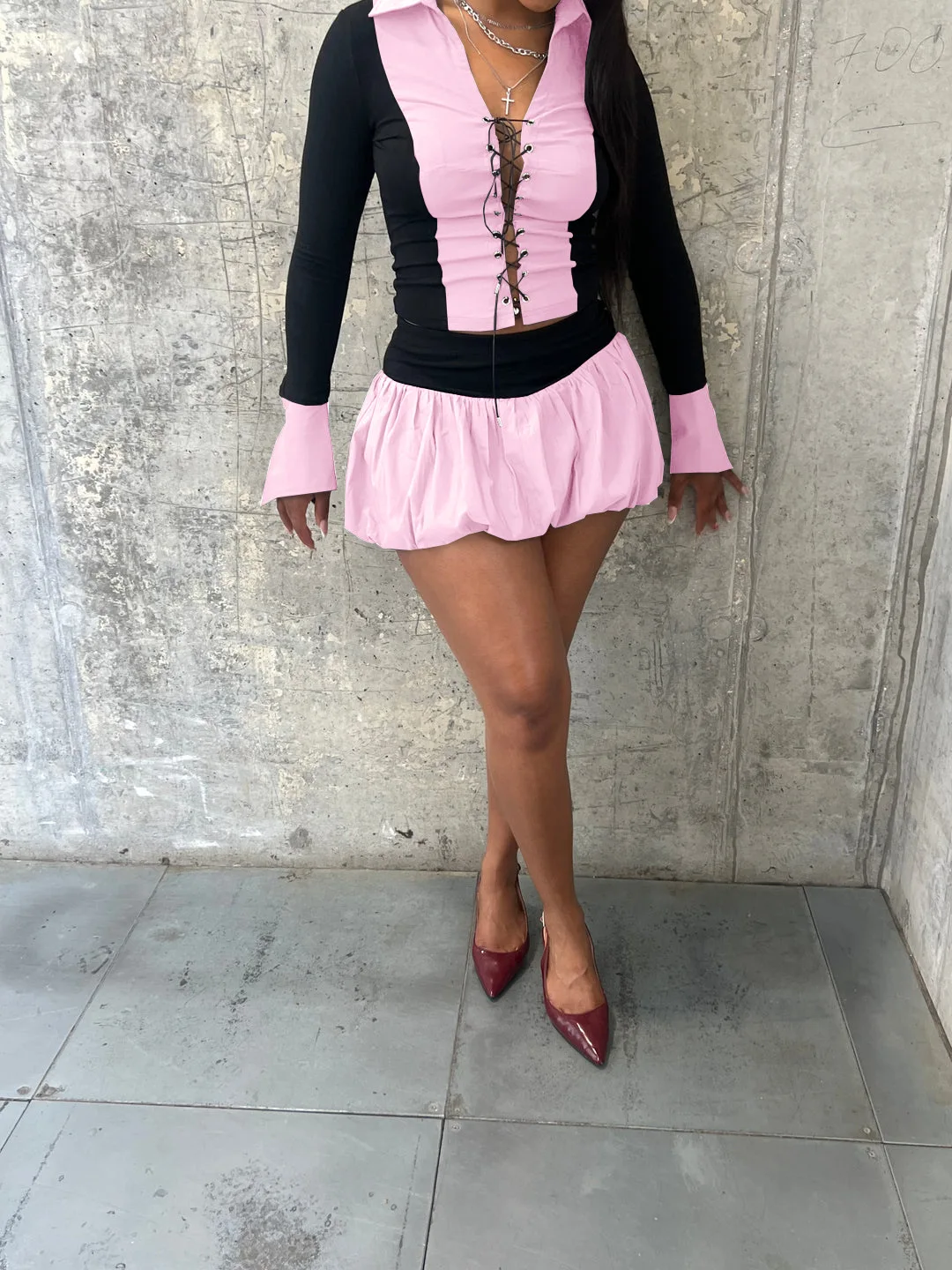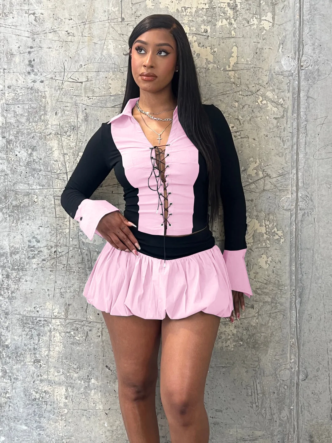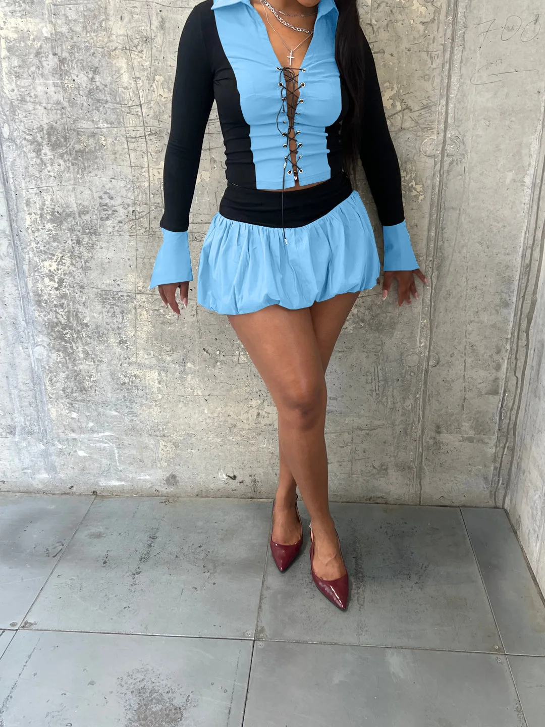 • Y2K Punk Two Piece Set for Women Hollow Out Bandage Patchwork Crop Top + Puffy Bubble Skirt Suits Hot Girl Streetwear