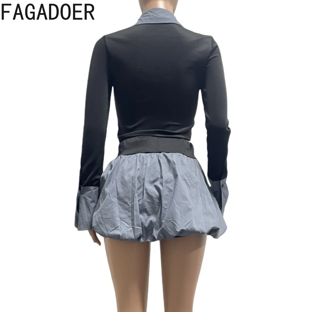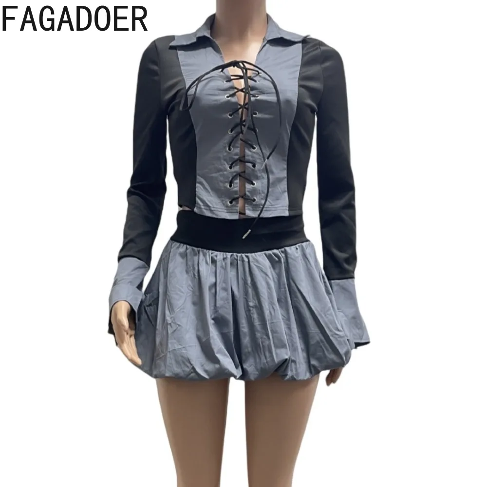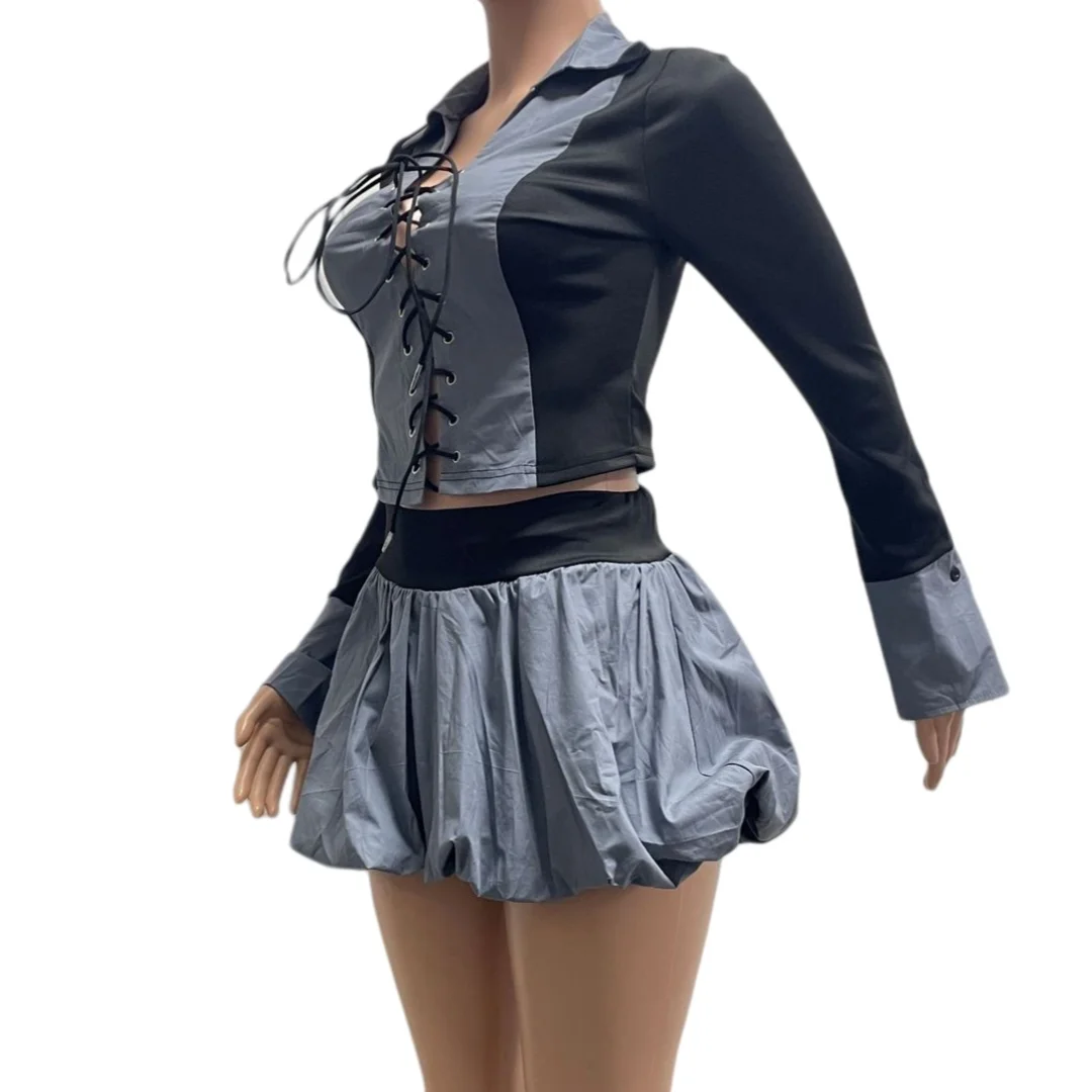 Y2K Punk Two Piece Set for Women Hollow Out Bandage Patchwork Crop Top + Puffy Bubble Skirt Suits Hot Girl Streetwear